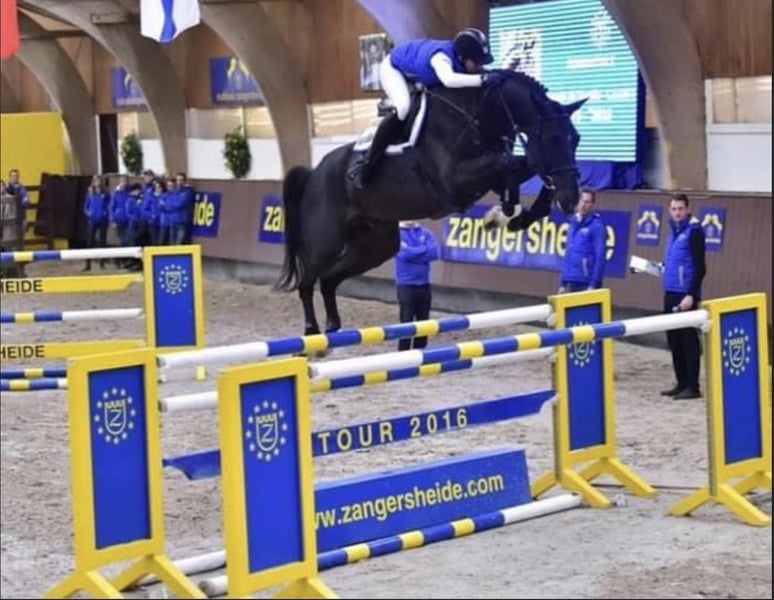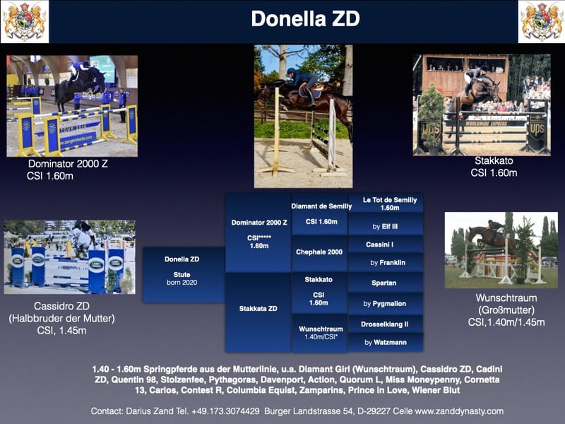 Beautiful dark bay Oldenburg mare with caution and talent. In 2024, she foaled a very promising filly by Taloubet Z. This year, she was backed and is already very well ridden, jumping very well under the rider. She is also very suitable for young riders and could make a great riding horse for someone transitioning from ponies to horses. Donella is by Dominator 2000 Z out of Stakkato x Drosselklang II x Watzmann, from our own breeding. We have previously owned her mother and grandmother, both of whom competed successfully up to 1.40 m and were also placed internationally in Italy and Luxembourg. Donella comes from a highly successful family. Her dam is the half-sister to Cadini ZD (1.40 m) and the half-sister to Cassidro ZD (CSI** 1.40/1.45 m). The dam line of the Hannoverian mare Klingy x Stamm 1192407/Schridde 670 (Darius Zand) includes numerous successful sport horses (show jumping 1.40 m – 1.60 m), such as Diamant Girl 7, bred as Wunschblume by Drosselklang II, Quentin 98 by Quintender x Colman (1.40 m), Stolzenfee by Stolzenberg x Silvio (1.40 m), Pythagoras 27 by Prince Thatch xx x Novum xx (1.45 m), Wunschtraum / Diamant Girl 7 by Drosselklang II x Watzmann x Novum xx (1.40 m), Cassidro ZD by Cassini II x Drosselklang II (1.40 m), Davenport by Drosselklang II x Prince Thatch xx (1.45 m), Action by Accorado (1.40 m), Quorum L by Quattro B x Rubinstein I x Drosselklang II (1.45 m), Miss Moneypenny 5 by Pik Bube I (1.40 m), Cornetta 13 by Cornet Obolensky x Conway (1.40 m), and internationally successful horses such as Carlos by Cornet’s Stern x Conway x Grannus x Watzmann (1.60 m). The genetics of Donella are exceptional, combining valuable sires: **Dominator 2000 Z** Champion horse of Christian Ahlmann with numerous successes in 1.60 m classes. Dominator 2000 Z, the reigning champion of Zangersheide Stud, captivated audiences with his spectacular performances at the most prestigious shows worldwide. He won the CSI 5* 1.60 m GCT Grand Prix in Stockholm and Hamburg, the CSI 5* 1.60 m GCL Playoff 2021 in Prague, and the CSI 5* 1.60 m Grand Prix in Doha, among many other podium finishes and awards. **Stakkato** One of the top sires in show jumping and a key foundation stallion for the Hanoverian breed. Stakkato is among the leading jumping sires in the integrated breeding value rankings. In 2007, he was named Hanoverian Stallion of the Year. Countless successful sport horses trace back to him. Stakkato is a legend in show jumping breeding! **Drosselklang II** One of the most influential Hanoverian stallions in show jumping breeding. He achieved top results in his stallion performance test and overcame a serious injury in 1996 that nearly ended his career. His resilience and intelligence allowed him to recover. In 2001, he was named Hanoverian Stallion of the Year. Over his 20-year breeding career at Celle, he produced numerous successful offspring, including many CSI 5* jumpers (1.60 m), 21 state premium mares, and eleven licensed sons. **Watzmann** The legendary Hannoverian sire Watzmann is renowned for passing on exceptional jumping ability. His most successful son is the Hannoverian gelding “Walzerkönig,” from Watzmann out of the “Ahnentafel” of “Absatz.” Under riders Franke Sloothaak and Rene Tebbel, Watzmann (born 1979, died 2000) won nearly every major Grand Prix in Europe, including the German Championships in 1989 and 1991, the Aachen Grand Prix in 1990, and multiple Zürich Classics. His total winnings exceeded 1.3 million Deutsche Marks. His greatest achievement was winning team gold at the 1988 Seoul Olympics. Watzmann is currently available to breeders through embryo transfer as part of the Hanoverian breeding experiment and remains a hero of his era, inspiring many Hannoverian show jumpers. We breed with mares of the highest genetic quality, pairing them with sport-successful stallions such as Baloubet du Rouet, Casall, Clarimo, Cornet Obolensky, Diamant de Semilly, Dominator 2000 Z, Dourkhan Hero Z, Eldorado van de Zeshoek, Kannan, Nabab de Reve, Quidam de Revel, and Taloubet Z, producing foals and young horses up to successful sport horses. For inquiries, please contact +49 173 3074429 or info@zanddynasty.com.
