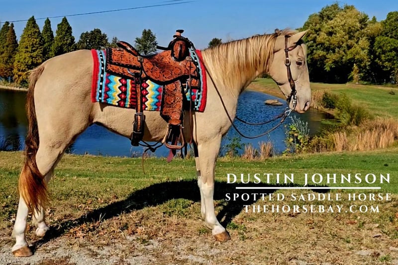Dustin Johnson is a gorgeous champagne and white Tobiano, registered Spotted Saddle horse with a beautiful streak of amber in his tail. This super-talented 8-year-old gelding has the right amount of talent, mind, and stamina to sail over miles of trails with you effortlessly. His gaits and transitions are smooth. Riding buddies often talk about how he’s hardly sweating on rough uphill and downhill terrains. He loves riding over the Midwest’s trails, rivers, streams, and hills. He drinks easily and is not a spooky horse. Dustin has a very smooth cantor and a nice long stride for walking. He gaits slow, medium, and pretty darn fast, as you will see in the video on the highway. Dustin is a great traveling horse, with no pawing and easy loading front in and back out. As long as he has hay to munch on, he will go long distances. We have trailered to Florida from Indiana the past two winters, with an overnight. We ride with as many as 12 gaited horses at a steady clip. He can lead and set the pace for such a big posey, or bring up the flanks, or ride in the middle. Smaller groups, non-gaited horses, and solo make no difference to Dustin. He is excellent in the campground, and at home. He bathes, grazes with all the horses, and relaxes in his stall with strangers around him. Peaceful on a hitching post and rarely buddy sour. Grooms easily, good for the farrier, side passes and saddles up nicely. It won’t take long if you want to teach him something new. Dustin Johnson is a very talented 8-year-old gelding with a good mind.