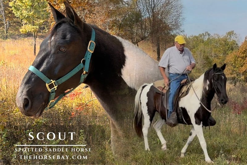 “SCOUT” – Flashy Black & White Spotted Saddle Horse Gelding ?Age: 10 years | Height: 14.2 hands | Breed: Spotted Saddle Horse | Color: Striking Black & White If you’re looking for the perfect combination of beauty, brains, and dependability, Scout is your guy! This flashy black-and-white gelding turns heads wherever he goes and has the kind of calm, willing attitude that makes him a dream partner on the trail. Scout stands a handy 14.2 hands, the perfect size—big enough to carry an adult comfortably, yet small enough to mount and dismount with ease. He’s surefooted, sound, and built to handle all kinds of terrain with confidence. Whether you’re exploring the mountains, crossing creeks, or winding through wooded trails, Scout takes it all in stride. ? Trail-Tested and Traffic-Safe Scout is solid on the trail—not spooky, steady through brush, over wooden bridges, obstacles such as teeter-totters, shower curtains, and others. He’ll lead the group, follow, or ride out alone without a fuss. He’s happy to trail blaze, climb hills, cross ditches, and even lets you trim branches or drag objects from the saddle. ? Easy and Enjoyable to Be Around Scout has a gentle, people-loving personality. He’s usually the lowest on the totem pole in the herd and gets along with everyone. He’s easy to catch—comes running when you call—and stands quietly for grooming, saddling, mounting, and dismounting. He takes the bit easily, picks up his feet, and truly enjoys attention (especially belly scratches and nice baths after his rides!). ? Well-Desensitized and Ready to Go Scout has been exposed to traffic, farm equipment, side-by-sides, and just about everything we can think of. He stays calm and confident no matter what’s going on around him. ? Health and Maintenance Scout is sound, shod all the way around, with current teeth, float, all vaccinations, and good feet. He’s 100% ready for his next partner to enjoy right now. ✨ Highlights at a Glance: 10-year-old, 14.2-hand gelding – ideal size for easy mounting Eye-catching black & white spotted coat – guaranteed attention-getter Safe, sound, surefooted, and traffic-safe Great alone or in a group, front or back of the line Not spooky – solid on obstacles and trail challenges Gentle ground manners, easy to handle, loves attention Up-to-date on all care and ready to ride today If you’ve been searching for a dependable, fun, and strikingly beautiful trail partner, Scout is the total package. Horses like him don’t come around often! Location: Arkansas