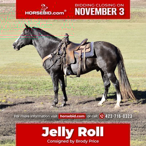 ⚜️𝐓𝐇𝐄 𝐅𝐀𝐋𝐋 𝐇𝐄𝐑𝐈𝐓𝐀𝐆𝐄 𝐂𝐋𝐀𝐒𝐒𝐈𝐂⚜️ Happening now thru MONDAY | NOVEMBER 3rd - Available EXCLUSIVELY on HorseBid's website! For more details and to register visit: www.Horsebid.com CONSIGNOR CONTACT: Brody Price 423-716-0323 LOCATION: Cleveland TN BREED: Saddle horse REGISTERED: No COLOR: Black roan HEIGHT: 15.1 AGE: 12 GENDER: Gelding Jelly Roll Are you looking for a gentle giant to share your adventures with? Look no further than Jelly Roll, a 12-year-old saddle horse gelding with a heart of gold! Standing at 15.1 hands, Jelly Roll is suitable for riders of all ages and experience levels, from 8 to 80 years old. Jelly Roll is a calm and composed companion, always eager to please. He stands patiently for shoeing, saddling, grooming, and bathing, making him a breeze to care for. His gentle nature ensures that he's easy to catch, and he'll happily follow you around. Jelly Roll has been trained to respond to one-hand cues, making him an excellent choice for riders of all skill levels. Whether you're a seasoned pro or a beginner, Jelly Roll will guide you smoothly and effortlessly. Jelly Roll's calm demeanor and gentle disposition make him an ideal companion for: - Children and adults looking for a reliable trail horse - Experienced riders seeking a smooth ride - Seniors or those with mobility issues who need a gentle and patient mount *Don't miss out on this wonderful opportunity* If you're looking for a loyal companion that will be by your side through thick and thin, Jelly Roll is the perfect choice. Contact us today to schedule a test ride and discover the joy of riding with this gentle giant! You can buy with confidence!!