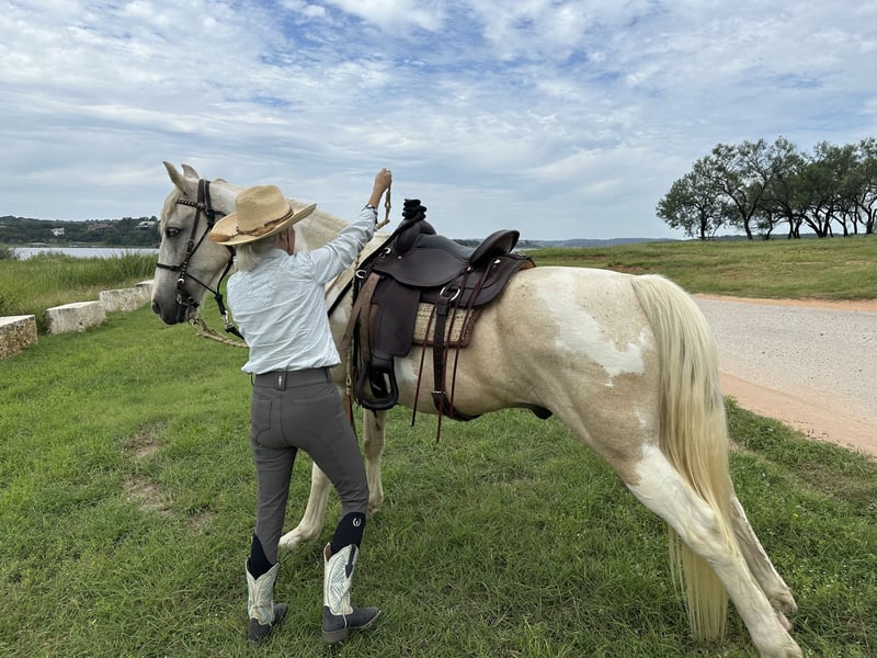 "AVAILABLE ON ONLINE HORSE AUCTION AT www DOT MagicHorseAuction DOT com BIDDING OPEN NOW thru TUESDAY | November 11TH! - BUY IT NOW AVAILABLE! *Final price will be determined on auction site* CONSIGNOR CONTACT INFO: Louise Lander 512-461-4972 LOCATION: Marble Falls, TX Chance is a Beautiful, Smooth, Gentle Gaited 15-year-old American Spotted Saddle gelding. Don’t let his age fool you, he has tons of get -up-and -go!! He stands at 15.2 and is the gentle giant. He came from an owner of 8 years and obviously was well cared for and very well trained. He has all the accolades one would look for in a horse. Ground manners: He is quiet and calm when tied, and I usually only need to ground tie him because he stands where I leave him. (seen in my videos) Loves grooming, great for the farrier and vet. He has had his teeth floated twice since I’ve had him. The farrier has come every 6 weeks for the entire year since I’ve had him too. (Natural hooves) He loads and travels wonderfully( quiet, and very patient). He will stay tied for any amount of time. He usually follows me with out a lead when finished riding and will follow me to the tack area where I take off his tack.(as seen in video) Round pen: He lunges with a lead and without a lead. Walks or gaits when cued. He will come to you and follow one around the arena w/o a lead. Backs up on cue as well. (seen in video) I have taken lessons with him for many months to help improve my riding knowledge. He has been patient with me . He knows leg pressure and is versatile with direct and neck rein. He knows one rein stop. Backs up calmly and moves hind quarters and fore quarters well. I have done a few obstacles (logs, tires, going between cones and stepping over bars and through hanging sheet and noodles. General information: He is not bothered by pistol shooting( shot balloons off of him too), flags, umbrellas, carrot stick slapping on the ground, or balls. He has been around farm equipment and dogs and is fine around all of it. He was used for trail riding and camping by his previous owner. I have only ridden on trail with him in groups, and he does well in any position (lead, middle, last). He stands well for mount and will rack out as well if needed. He walks off with loose rein or will wait patiently until cued to move out. He has a smooth-running walk and smooth gait. (seen in multiple videos). Most importantly, he has a sweet disposition and in great health. I wanted to grow old with him, but due to some recent family health obligations, I cannot keep him. I even bought a new trailer for him and a new saddle. I truly wanted him to be my forever last horse. However life sometimes can take one on a different path not planned. He loves apples and carrots, which I give him often. At put-up time and feeding time, all I do is call him, and he comes running and goes straight into his stall and stands right in front of his trough. He will wait till I get there. It’s really so heartwarming. He also loves his fly mask, which I will send with him. (I also have a Circle Y Topeka Trail Flex 2 padded western saddle sz.15 seat that’s available for sale if interested, fits him very well). I will also send the two different bits I have used, if anyone would like that they are available . He is an easy keeper and would make a great companion on the trail and arena lessons as well.I would also recommend an experienced rider as well. He is also UTD on all vaccines.