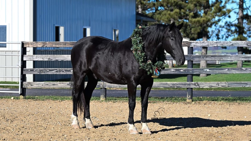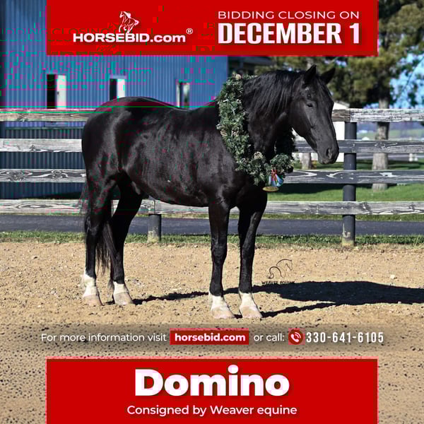 ⚜️ 𝓽𝓱𝓮 𝐇𝐨𝐫𝐬𝐞𝐦𝐚𝐧'𝐬 𝓢𝓱𝓸𝔀𝓬𝓪𝓼𝓮⚜️ Happening now thru MONDAY | DECEMBER 1st - Available EXCLUSIVELY on HorseBid's website! For more details and to register visit: www.Horsebid.com CONSIGNOR CONTACT: Weaver equine 330-641-6105 LOCATION: Fredericksburg, OH BREED: Crossbred REGISTERED: No COLOR: Black HEIGHT: 16 AGE: 9 GENDER: Gelding Domino is a very well broke 9-year-old gelding. He does great under both English and Western disciplines. He is amazing in the arena . He will lope a circle nicely. Picks up both leads correctly. Has a beautiful walk trot canter transition. He will respond to leg yields. Stops and backs up nicely when asked. Stands at a mounting block. Domino also loves a good day of jumping. He's super athletic as well as quiet which makes him a breeze to have around . He would make a great dressage or eventing gelding.crosses obstacles with ease. Lays down on command. He does not mind a tarp or flag. Super sensible guy. He is great out and about as well. He does great on the roads as well as on the trails. He does not mind riding in a group or out alone. He does not mind dogs . He will cross Creeks easily. Steps over logs. He will conquer the hills with ease. He does not mind traffic. Stops and stands well when asked. This pretty guy has seen it all. He is an absolute gentleman on the ground. He is easy to lead. He is easy to catch in his stall or in the pasture. He does great when turned out with other horses. He will stand patiently to be groomed and tacked. He will do great in the cross ties or ground tied. He will stand nicely for the farrier. He will pick his four feet nicely. Super quiet gentleman that is easy to handle all around. No maintenance 100% sound.