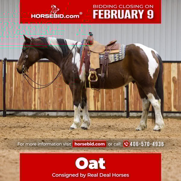 ❤️🔥𝑩𝒆 𝑴𝒊𝒏𝒆 𝐒𝐄𝐋𝐄𝐂𝐓❤️🔥 Happening now thru MONDAY | FEBRUARY 9th - Available EXCLUSIVELY on HorseBid's website! For more details and to register visit: www.Horsebid.com CONSIGNOR CONTACT: Real Deal Horses 406-570-4936 LOCATION: Ripley, OK BREED: Draft X REGISTERED: No REGISTERED NAME: Oat COLOR: Bay and white paint HEIGHT: 16 AGE: 12 GENDER: Gelding Oat is a 12 year old bay and white paint gelding standing a true 16 hh wearing a 3# shoe and built like a horse that has earned his keep. He’s ranch made, broke and seasoned. The kind that you can haul anywhere and go to work on. He trail rides without a fuss, has picked up broncs, shagged bulls and has caught more loose cattle than most horses will ever see. He’s even drug a buffalo out of the brush. He’s also broke to drive! He has been used several winters to feed hay. Oat is straight up dependable with a good mind, a big motor, and no nonsense. One hand neck rein, lope a nice circle in the arena, open and shut gates off of him, you name it, solid handle! Ready to step off the trailer and go to work for whoever swings a leg over him. Oat is an absolute dream to shoe, our farrier has been in the business for 30+ years and says this is one of his most favorite horses he’s ever shod. He picks his foot up for you and holds it on his own. He’s great to catch and be around and is an absolute gentleman on the ground. Good to tie, load, saddle, you name it. He is absolutely gorgeous and photos don’t begin to give him justice. Sound and sane. Give us a call for more info at 406-570-4936