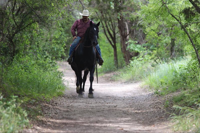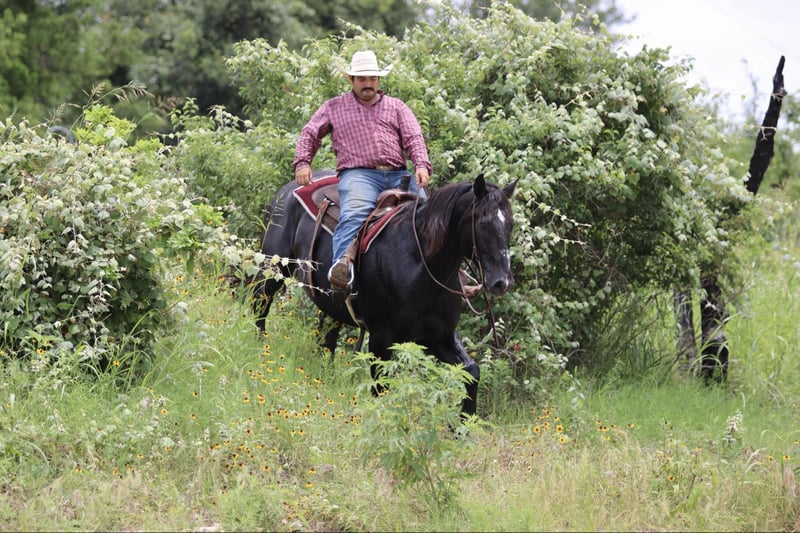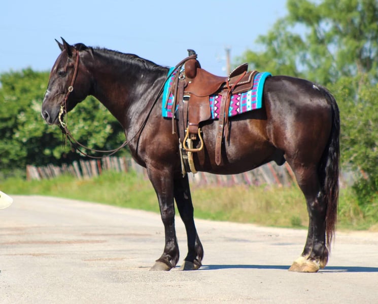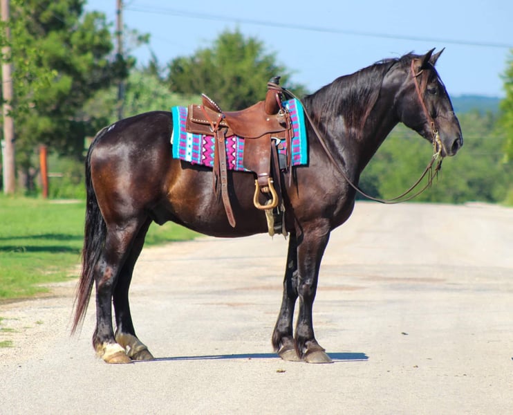 ONLINE AUCTION PLACE YOUR BIDS AT PLATINUMEQUINEAUCTION DOT COM $3500 STARTING BID AUCTION ENDS JUNE 30TH KING KONG is the WHOLE package !! Tall , thick , coal black . He is a 12 year old percheron / quarter horse cross black gelding standing 16.2 hds tall ! He has seen more than most people ! He spent most of his life in Amish country where he was born , raised and trained . He has been used extensively to pull a buggy and has worked the fields . Not only does King Kong drive he rides just as good and is a fun one to take down the trails. There isn’t a mountain he can’t climb , he is sure footed and goes wherever you point him . He will cross logs , bridges , tarps , and water with no issues at all . King is happy to go wherever you point him . He will ride out in a group or by himself . Ride him to town or drive him he’s been around heavy traffic a ton in his life and is not bothered by it. King Kong can carry and pull just about anything. He does great out in a herd setting with other horses , easy to catch in the pasture . He ties , loads and unloads off the trailer great . Stands for the farrier with no issues at all unlike many drafts he stands like a perfect gentleman. If you need help with transport don’t hesitate to ask we have a list of reputable haulers that can get him safely to your doorstep world wide. Located in Stephenville, TX. Contact M $ Performance Horses Michelle 661-817-9120