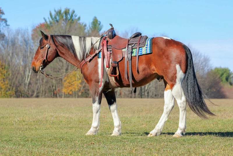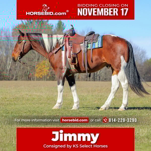 🎲𝓽𝓱𝓮 𝐑𝐈𝐃𝐄𝐑'𝐒 𝓒𝓱𝓸𝓲𝓬𝓮🎲 Happening now thru MONDAY | NOVEMBER 17th - Available EXCLUSIVELY on HorseBid's website! For more details and to register visit: www.Horsebid.com CONSIGNOR CONTACT: KS Select Horses 814-229-3290 LOCATION: Clarion, Pa BREED: Draft Cross REGISTERED: No REGISTERED NAME: Jimmy COLOR: Bay and white Paint HEIGHT: 15.2 AGE: 13 GENDER: Gelding Jimmy is a All Around Good Broke and Super Safe Family Horse. If you been in the market for that safe horse to take out and go have a stress free ride then Jimmy is the one. Super Quiet and Gentle !! Very Seasoned on the trails and has been ridden many of miles on the ranch. Jimmy is great on the trails and vey sure footed in the rough terrain. If we had a dollar for every mile Jimmy has been trail ridden we would be rich ! He is the type of horse that will make a city slicker look like a cowboy! If your a timid rider or just starting out and wanting to get into horses Jimmy would make a confidence booster horse or a first time horse owner a good horse to get started with. He is also the kind of horse a experienced horseman can take out and have fun on and do any job also. Jimmy grew up on a large cattle operation and is capable of doing any job on the ranch also. He is traffic safe and good around four-wheelers and farm equipment. If you been in the market for that all around super broke safe gelding then dont miss out on Jimmy! Call or Text Kris at 814-229-3290. We can help arrange delivery anywhere in the United States. Thank You and God Bless