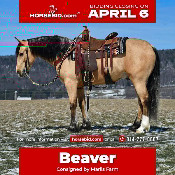 🌟𝑨𝒑𝒓𝒊𝒍 𝐀𝐋𝐋 𝐒𝐓𝐀𝐑 𝐋𝐈𝐍𝐄𝐔𝐏🌟 Happening now thru MONDAY | APRIL 6th - Available EXCLUSIVELY on HorseBid's website! For more details and to register visit: www.Horsebid.com CONSIGNOR CONTACT: Marlis Farm 814-777-0607 LOCATION: Rebersburg, PA BREED: Crossbred REGISTERED: No COLOR: Buckskin HEIGHT: 14.3 AGE: 4 GENDER: Gelding ✨ Fancy & Versatile Buckskin Gelding – “Beaver” ✨ Beaver is a 4-year-old, 14.3 hand buckskin crossbred gelding that checks all the boxes for someone looking for a talented, eye-catching, and well-rounded partner. This gelding is well broke to ride, with a great foundation and all the right buttons. He is soft in the face, responsive, and rides around with a great feel. Beaver has a nice turnaround and really shines when you ask him to stop—he’ll plant his hind end and give you a big, impressive stop every time. Not only is he fun in the arena, but he’s also been trail ridden and has experience being used for team penning and team sorting, making him a phenomenal, seasoned, and versatile gelding for a variety of jobs. On top of his ability, Beaver is super fancy and absolutely gorgeous to look at—the kind that turns heads wherever he goes. If you’re looking for a young gelding with talent, experience, and standout looks, Beaver is one you won’t want to miss. 📞 For more info or to come meet Beaver, call Mark 814-777-0607(call only). 🚚 We can help arrange shipping anywhere.