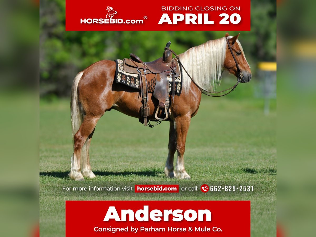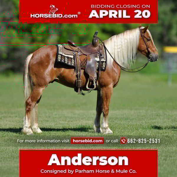 ⚜️𝐭𝐡𝐞 𝓔𝓵𝓲𝓽𝓮 𝐒𝐩𝐫𝐢𝐧𝐠 𝐂𝐥𝐚𝐬𝐬𝐢𝐜⚜️ Happening now thru MONDAY | APRIL 20th - Available EXCLUSIVELY on HorseBid's website! For more details and to register visit: www.Horsebid.com CONSIGNOR CONTACT: Parham Horse & Mule Co. 662-825-2531 LOCATION: Amory MS BREED: Crossbreed REGISTERED: No REGISTERED NAME: ANDERSON COLOR: Sorrel HEIGHT: 15.1 AGE: 4 GENDER: Gelding Anderson is a Friesian/Haflinger crossbred gelding standing 15.1 hands tall, with excellent substance and bone that give him the strength and versatility to excel in many disciplines. He is a young gelding that has been started correctly, setting him up for a successful future. In the arena, Anderson picks up both leads with ease and carries a soft, balanced trot with eye-catching movement. Out on the trails, he has proven to be reliable and willing, confidently taking in his surroundings. He offers a smooth, short lope and a slow, comfortable walk, making him enjoyable both in and out of the arena. Anderson has a big, friendly personality around the barn and is easy to catch, handle, and be around. He gets along well with others when turned out and is a pleasure to have in the pasture. This stout, well-built young gelding has a bright future ahead of him in any direction you choose. He has also been started in harness and shows great promise as a driving horse, with the potential to truly excel as he continues to develop.