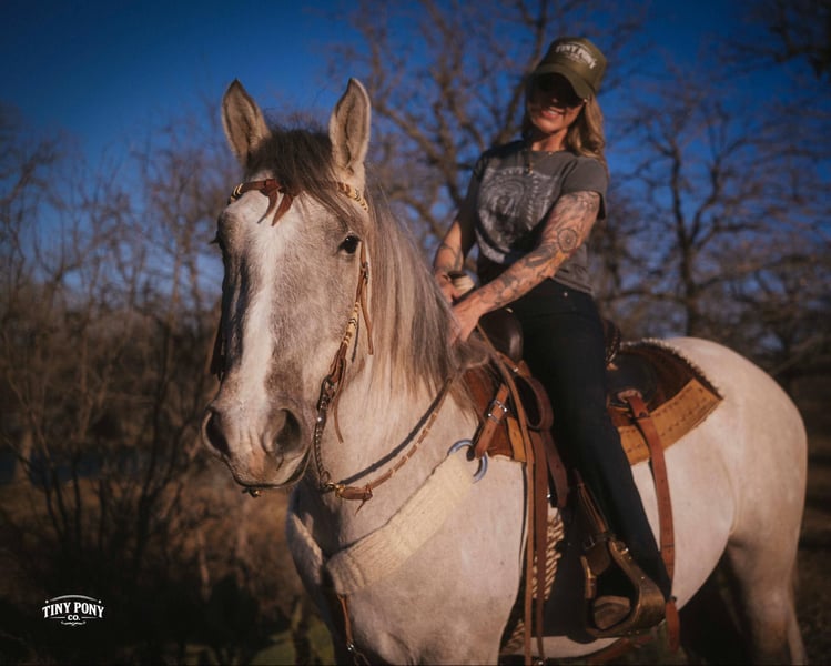 "AVAILABLE ON ONLINE HORSE AUCTION AT www DOT PlatinumEquineAuction DOT com BIDDING OPEN NOW thru SUNDAY | MARCH 15TH! *Final price will be determined on auction site* CONSIGNOR CONTACT INFO: Tiny Pony Co. 406-250-9530 LOCATION: Jacksboro, TX The horse that stays for the still, quiet moments. The one that always chooses your company, that makes you feel like the most important person on the planet - that’s Blackfoot. Not only is he rare in color and shape - not everyday you see a 15.2h line-backed silver buckskin Percheron/QH cross - but his calm, grounding energy is just as unique. He will happily put his head in your arms and stay that way as long as your heart desires. As a coming 4 year old, Blackfoot has a solid foundation and lovely manners. He will lope a circle, pick up all four feet, carry you down the trail, meet you at the gate, and put a smile on your face everyday. He is a solid traveler and enjoys off property adventures - he unloads confidently in new places. Blackfoot has been on field trips to other arenas where we have tested him out over low fences - and he has shown us two of the qualities we love the most : honesty and willingness. He is a comfortable ride, with three beautiful gaits - a lively walk, a soft, easy to sit trot and a smooth lope. He has learned to be responsive to leg cues and is already quite soft in the bridle. Blackfoot is easy to mount from the ground and stands still for you, every time. Flags, tarps, roping dummies, scattering chickens, darting barn cats - nothing seems to phase him. He will stand quietly and patiently on a loose, relaxed rein. With nice sized, sure feet and a strong, compact build, Blackfoot was born to carry weight. He would make an excellent backcountry trail mount, laid-back pleasure horse or your next personal therapist. This gelding has an easy going temperament and steady mind - he is the perfect example of why draft crosses are so popular - and we think the future is bright for this one. Blackfoot is relaxed in a herd, landing near the bottom of the pecking order. He also lives peacefully in a stall. He is currently barefoot and on a forage only diet - he has no trouble keeping his shape. He sells sound and UTD on vaccines - PPE welcome at buyer’s expense. Located in Jacksboro, TX. Text or call Courtney Maddux @ 406.250.9530 for with your questions!
