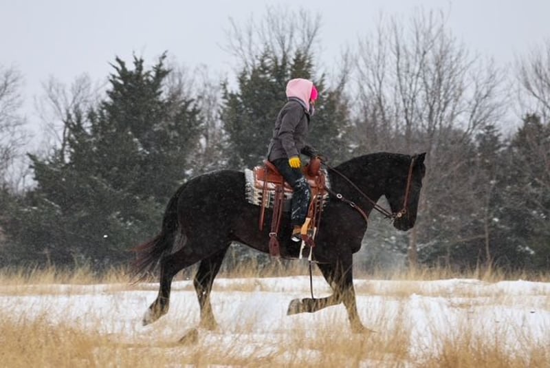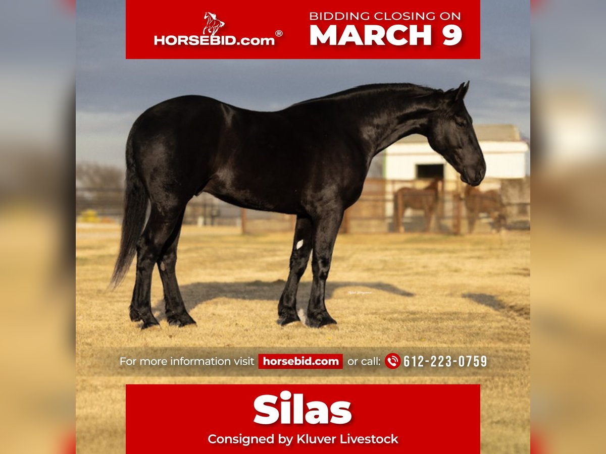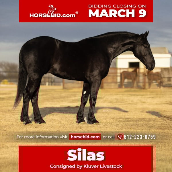 ℳ𝒶𝓇𝒸𝒽 ♦️𝐑𝐈𝐃𝐄𝐑'𝐒 𝐂𝐇𝐎𝐈𝐂𝐄♦️ Happening now thru MONDAY | MARCH 9th - Available EXCLUSIVELY on HorseBid's website! For more details and to register visit: www.Horsebid.com CONSIGNOR CONTACT: Kluver Livestock 612-223-0759 LOCATION: Ripley, OK BREED: Grade REGISTERED: No REGISTERED NAME: Silas COLOR: Black HEIGHT: 16.2 AGE: 4 GENDER: Gelding Silas is truly something special, and anyone who spends time with him will quickly see why! I’m so happy to offer Silas a 4 year old jet black crossbred gelding standing at 16.2 hands and weighs approximately 1400 pounds with the bone, presence, and build to turn heads wherever he goes. He is packed with love and a heart of gold. Don’t let his size scare you with a smooch and a click of a finger he’ll side pass to anything for you to get on… whether it’s a fence, tailgate, water trough, or anything you use! Silas is a horse that not only catches your eye but makes your jaw drop to the floor. He’s one of thoose horses that you could stare at for hours and not get bored. With his deep black coat, matching mane and tail, soft eye, and standout confirmation.. big hip, strong neck, clean legs, and a solid top line. Silas is built to impress. He’s an easy keeper, stays in great shape with minimal effort. He’s not only stunning but he truly has a heart of gold. He is the definition of a puppy dog all he ever wants is loving and pats. He is always wondering what you’re doing and wants to be in your pocket. If he could he would want to do everything with you! Don’t think you’re going to clean his stall without him practically begging for attention. He also LOVES treats and snacks! Now he’s not only just looks and personality he is very fun to ride anywhere! He is very willing to learn and easy to teach anything to! He is one hand broke with a turn around and stop. I have taken many reining lessons with him, rode him english not only in an arena but through town and trail rides, he has been roped off of, used for day work, used on the feed lot, carried the American flag at lots of rodeos, been in many parades, and trail rode more times than I can keep track of! Did I mention he dosnt bat an eye at fire. He is my go to ride for anything! I always say if I were to ride a horse through battle it would be him! You can saddle him english or western and take him anywhere or do anything without a bat of an eye! I sure have had a blast owning him and getting to work with him it’s now somebody else’s turn to enjoy this phenomenal horse!