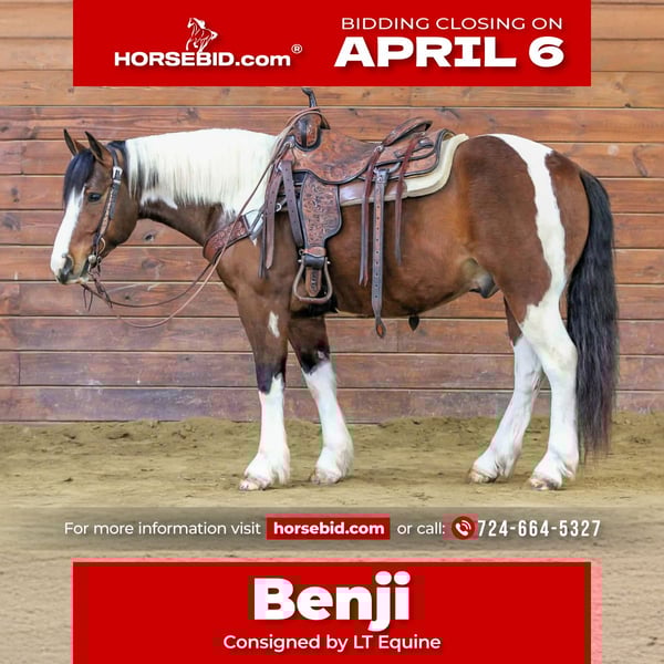 🌟𝑨𝒑𝒓𝒊𝒍 𝐀𝐋𝐋 𝐒𝐓𝐀𝐑 𝐋𝐈𝐍𝐄𝐔𝐏🌟 Happening now thru MONDAY | APRIL 6th - Available EXCLUSIVELY on HorseBid's website! For more details and to register visit: www.Horsebid.com CONSIGNOR CONTACT: LT Equine 724-664-5327 LOCATION: Miola, PA BREED: Paint crossbred REGISTERED: No COLOR: Tri color Tobiano HEIGHT: 14.1 AGE: 5 GENDER: Gelding ✨🐴 Meet Benji — The Little Tank With a Giant Heart! 🐴✨ If you’ve been searching for that safe, fun, do-anything partner that everyone in the family can enjoy… your search stops here 💥 Benji is a 5-year-old, 14.1 hand, stout-made Paint crossbred gelding built like a brick house in a perfectly compact package. Don’t let his height fool you — this guy is WIDE, sturdy, and more than capable of carrying riders of all sizes comfortably. He’s the perfect “easy to get on, hard to replace” size ❤️ But what truly sets Benji apart? His personality. This horse is a WORLD-CLASS sweetheart. He absolutely lives to be loved and wants to be everyone’s best friend. If you enjoy a horse that meets you at the gate, soaks up attention, and has a kind eye and gentle soul — you will fall head-over-heels for this boy 🥰 ⸻ 🧼 Ground Manners That Make Life Easy Benji is the definition of uncomplicated: ✔️ Easy to catch ✔️ Stands tied & cross-ties quietly ✔️ Loads & hauls like a gentleman ✔️ Excellent for the farrier ✔️ Bathes without drama ✔️ Picks up all four feet easily ✔️ LOVES grooming and attention No funny business. No nonsense. Just a good, honest gelding you can enjoy every day 👍 ⸻ 🌲 Trail Horse Deluxe Benji has seen the world and takes it all in stride. ✔️ Rides out alone or in a group ✔️ Confident and willing ✔️ Goes wherever you point him ✔️ Road safe ✔️ Not spooky ✔️ Handles obstacles with ease ✔️ Will carry a flag like a pro 🇺🇸 He’s the type you can relax on and just enjoy the ride 🌄 ⸻ 🏟️ Arena Ready & Willing In the arena, Benji is soft, responsive, and fun to ride: ✔️ Started nicely on a neck rein ✔️ Responds to leg pressure ✔️ Smooth trot ✔️ Easy, balanced lope and on point transitions ✔️ Will try ANYTHING you ask And here’s a show-stopper… ⭐ Benji is trained to lay down on command with a simple tap of the shoulder — a crowd favorite and a special bond builder 💫 ⸻ 🌟 Endless Possibilities Benji’s versatility makes him a fantastic choice for many homes: 🏡 Family horse 🎓 Lesson program superstar 🌲 Trail partner 🏆 English or Western prospect 🍀 4-H mount 🤠 Ranch horse ❤️ Confidence builder He truly has the brain, disposition, and willingness to go in any direction. ⸻ 🩺 Sound, Solid & Ready to Go ✔️ No vices ✔️ Sound and level-headed ✔️ Current vet check ✔️ Fresh shoes ✔️ Ready to hit the trail today ⸻ 🚚 Shipping assistance available nationwide Benji is the kind that’s hard to find — young, safe-minded, versatile, and genuinely kind. Horses like him don’t stay available long 💥 📩 If you have any questions about Benji, please don’t hesitate to reach out. We love talking horses and want to help him find the perfect home ❤️ Have a blessed day! ✨
