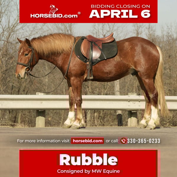 🌟𝑨𝒑𝒓𝒊𝒍 𝐀𝐋𝐋 𝐒𝐓𝐀𝐑 𝐋𝐈𝐍𝐄𝐔𝐏🌟 Happening now thru MONDAY | APRIL 6th - Available EXCLUSIVELY on HorseBid's website! For more details and to register visit: www.Horsebid.com CONSIGNOR CONTACT: MW Equine 330-365-0233 LOCATION: Baltic, OH BREED: Draft Cross Pony REGISTERED: No COLOR: Sorrel HEIGHT: 14.2 AGE: 5 GENDER: Gelding ✨ Meet Rubble — The Ultimate Family Pony! ✨ If you’ve been searching for that once-in-a-lifetime, safe and reliable partner… your search ends here. 💥 Rubble is the one. 💥 This 14.2 HH 5-year-old Draft × Pony cross gelding is the definition of quiet, kind, and trustworthy. We’ve had Rubble for the past three years, giving him the absolute best start possible—and it shows in everything he does. 🐴 Safe for ANY level rider — from first-timers to experienced riders 🏡 The perfect family horse — dependable, gentle, and forgiving 🏇 Kid-approved hunter pony prospect — cute, willing, and talented Rubble has been everywhere and done it all: ✔️ Trail rides for miles ✔️ Traffic safe & unbothered ✔️ Crosses logs, creeks, and obstacles with ease ✔️ Takes everything in stride with a calm, steady mindset He offers three smooth, easy gaits — a relaxed walk, steady trot, and a soft, rocking-chair canter that makes him a joy to ride. 💛 With his sweet personality and quiet nature, Rubble is the kind that builds confidence and creates unforgettable memories for the whole family. 📍 Located in Baltic, Ohio 📞 Contact Marcus: 330-365-0233 🔥 Safe. Broke. Proven. The kind everyone is searching for. 🔥