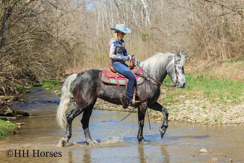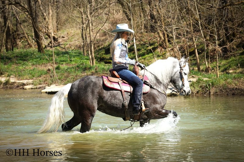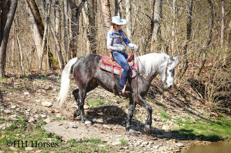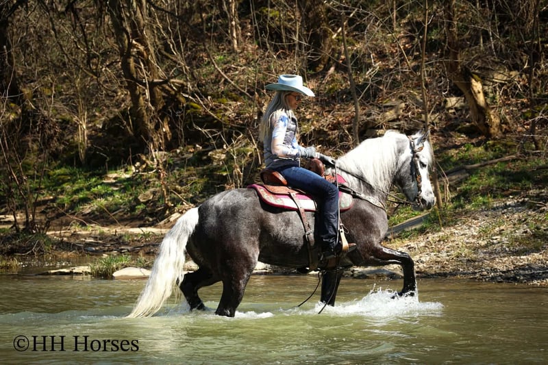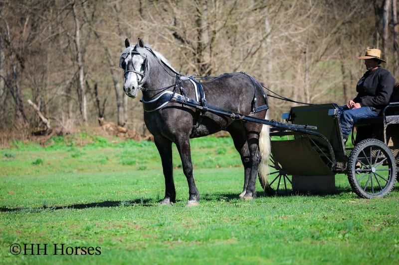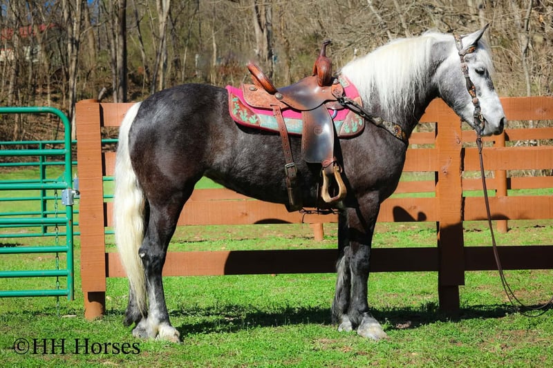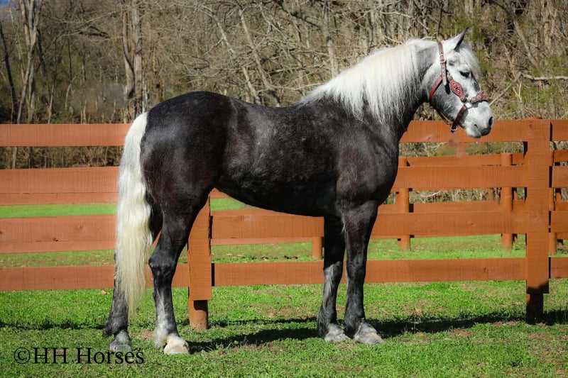 ⚜️𝓽𝓱𝓮 𝐆𝐎𝐋𝐃 𝓢𝓮𝓵𝓮𝓬𝓽⚜️ Happening now thru MONDAY | MARCH 23rd - Available EXCLUSIVELY on HorseBid's website! For more details and to register visit: www.Horsebid.com CONSIGNOR CONTACT: HH Horses 304-238-4155 LOCATION: Flemmingsburg, KY BREED: Draft Cross REGISTERED: No COLOR: Grey Dapple HEIGHT: 15.2 AGE: 5 GENDER: Mare This is "SILVER FOXY", a real attractive, gentle, well broke PERCHERON MORGAN CROSSBRED MARE that is broke to ride and drive. This mare oozes eye appeal. This mare has been trail ridden extensively, she has been through the cross country driving courses, and she aims to please. She stands a stocky 15.2 hands tall, she is 5 year old, and is a gorgeous dark silver dapple with a white mane, foretop, and tail. She has excellent ground manners, she stands to tack, harness, hitch, mount, and groom. She rides and drives out alone with no fuss, she goes anywhere you point her, and is extremely brave and confident. She is not marish, she gets along well with other horses, and she does whatever is asked of her with a can do attitude. She has pulled carts, wagons, and been hooked to farm machinery. She can carry a heavy rider and haul a heavy load under harness. She is sturdy and strong, yet gentle and easy to manage. She is user friendly, traffic safe, and not spooky. She lopes off with no hump and no buck. This mare is extra special with her coloring, her ride, her drive, and her personality. Don't miss out on a real unique and versatile horse.