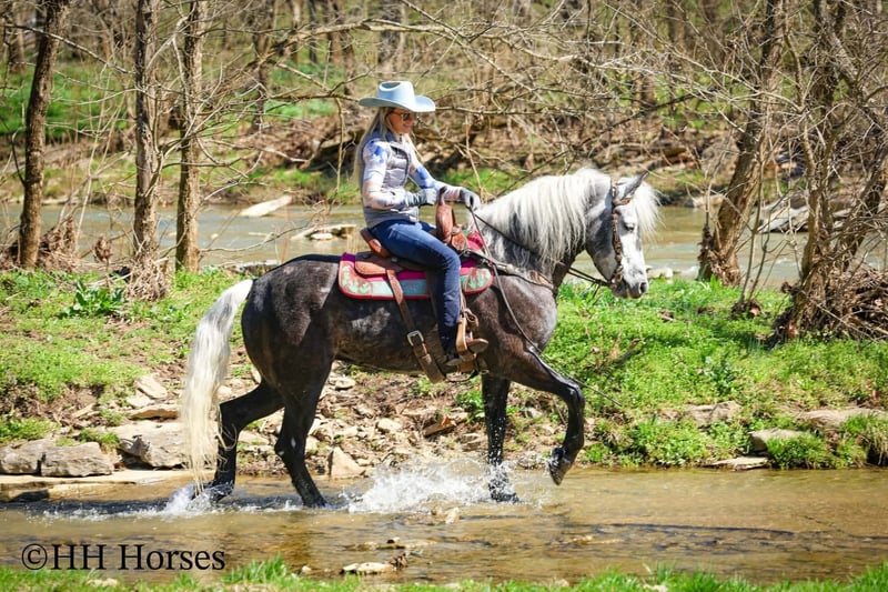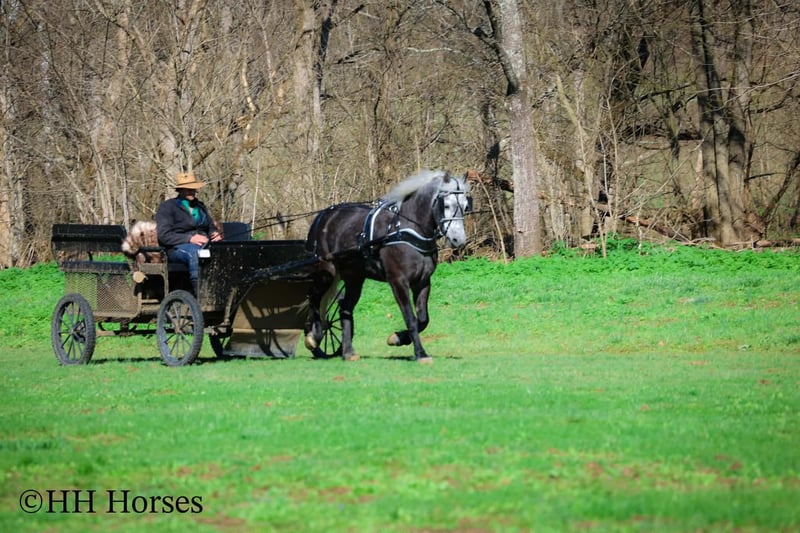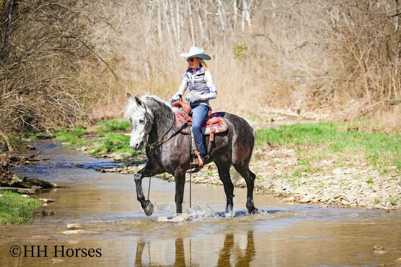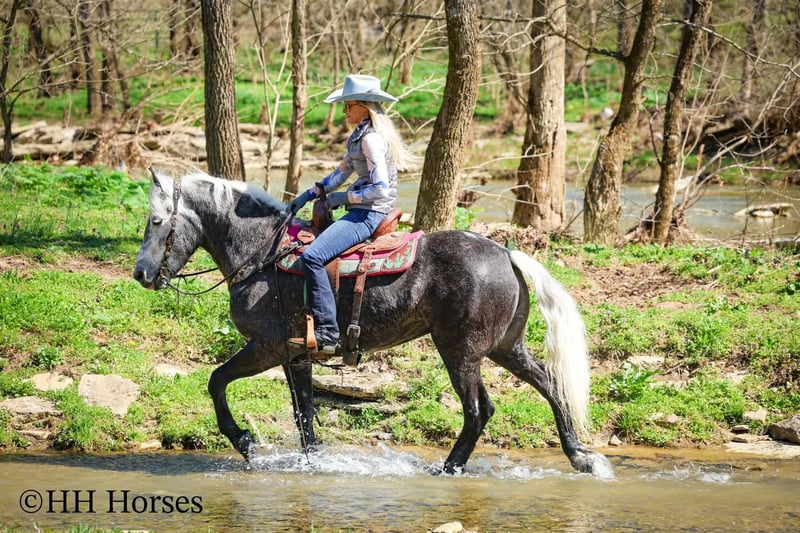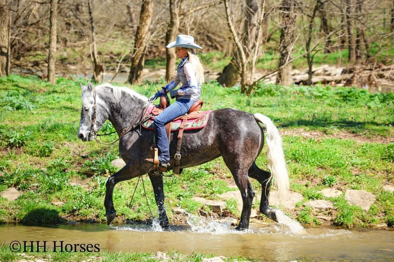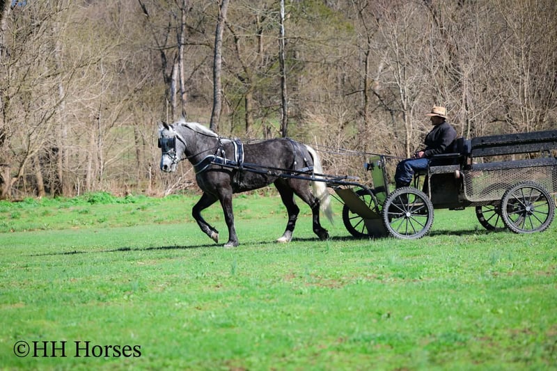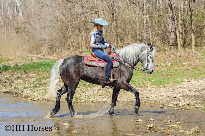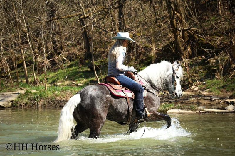 ⚜️𝓽𝓱𝓮 𝐆𝐎𝐋𝐃 𝓢𝓮𝓵𝓮𝓬𝓽⚜️ Happening now thru MONDAY | MARCH 23rd - Available EXCLUSIVELY on HorseBid's website! For more details and to register visit: www.Horsebid.com CONSIGNOR CONTACT: HH Horses 304-238-4155 LOCATION: Flemmingsburg, KY BREED: Draft Cross REGISTERED: No COLOR: Grey Dapple HEIGHT: 15.2 AGE: 5 GENDER: Mare This is "SILVER FOXY", a real attractive, gentle, well broke PERCHERON MORGAN CROSSBRED MARE that is broke to ride and drive. This mare oozes eye appeal. This mare has been trail ridden extensively, she has been through the cross country driving courses, and she aims to please. She stands a stocky 15.2 hands tall, she is 5 year old, and is a gorgeous dark silver dapple with a white mane, foretop, and tail. She has excellent ground manners, she stands to tack, harness, hitch, mount, and groom. She rides and drives out alone with no fuss, she goes anywhere you point her, and is extremely brave and confident. She is not marish, she gets along well with other horses, and she does whatever is asked of her with a can do attitude. She has pulled carts, wagons, and been hooked to farm machinery. She can carry a heavy rider and haul a heavy load under harness. She is sturdy and strong, yet gentle and easy to manage. She is user friendly, traffic safe, and not spooky. She lopes off with no hump and no buck. This mare is extra special with her coloring, her ride, her drive, and her personality. Don't miss out on a real unique and versatile horse.