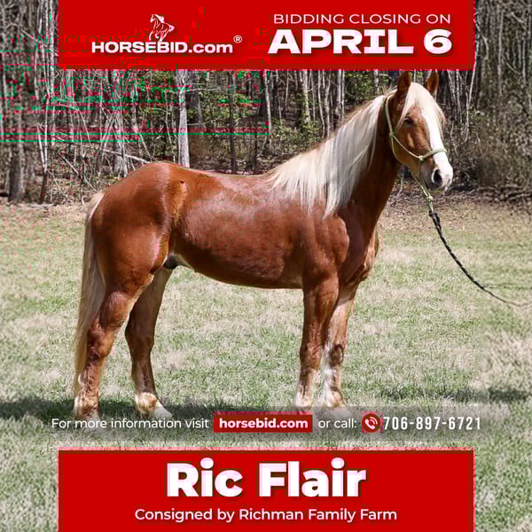 🌟𝑨𝒑𝒓𝒊𝒍 𝐀𝐋𝐋 𝐒𝐓𝐀𝐑 𝐋𝐈𝐍𝐄𝐔𝐏🌟 Happening now thru MONDAY | APRIL 6th - Available EXCLUSIVELY on HorseBid's website! For more details and to register visit: www.Horsebid.com CONSIGNOR CONTACT: Richman Family Farm 706-897-6721 LOCATION: Blairsville, GA BREED: Draftcross REGISTERED: No COLOR: Sorrel HEIGHT: 16.1 AGE: 5 GENDER: Gelding "I'm RIC FLAIR. The stylin' and profilin', limousine ridin', jet flyin', kiss stealin', wheelin' 'n' dealin' son of a gun." If you don't want people looking your way, he's not your horse. Ric is a stunning draft cross gelding, standing at 16.1H. Ric flair is also at a wonderful age of 5yrs old. Ric has as much mane and tail as he does personality. Ric has been rode extensively in the Appalachian mountains. He will cross water, go over logs, and is traffic safe. He has been put through mounted patrol training, and absolutely excelled in that. He can also do arena work too. Ric has an amazing W/T/C. This handsome fella will pick up both leads flawlessly in the arena just like your little QH will. Ric moves very well off of leg pressure. Ric also will side pass with ease, and open and close gates, and even come pick you up, so you don't have to climb on. There isn't much we haven't put him through, and he has never said no. We've rode mostly western, but he has rode english quite a bit as well. Ric is very willing to please his rider and could go in any direction that you want to go. He is the kind you can show on Saturday and trail ride on Sunday. I've had him in a 5 acre field to a 65 acre field. If you can't catch him it's because you have a grizzly bear behind you. He truly is a gentleman in every way. Ric will come UTD on shots, shoes, coggins, and worming. If you have any other question feel free to call me at 706-897-6721.