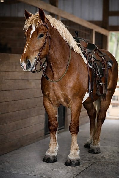 Seguro, versátil, apto para esposos. Macho de 5 años, castaño, cruce de draft y caballo gelding.