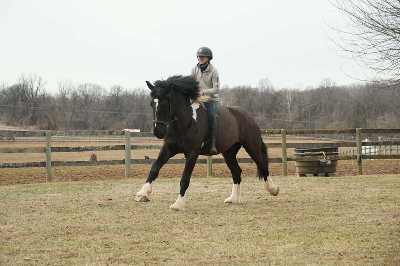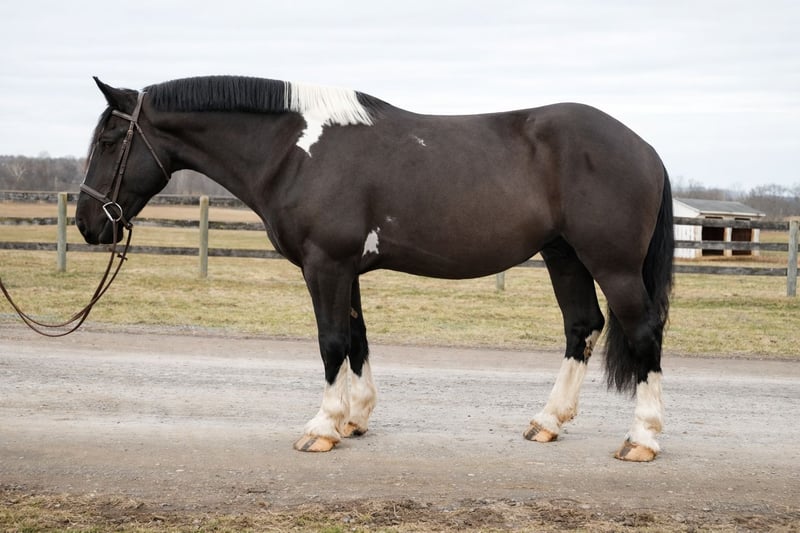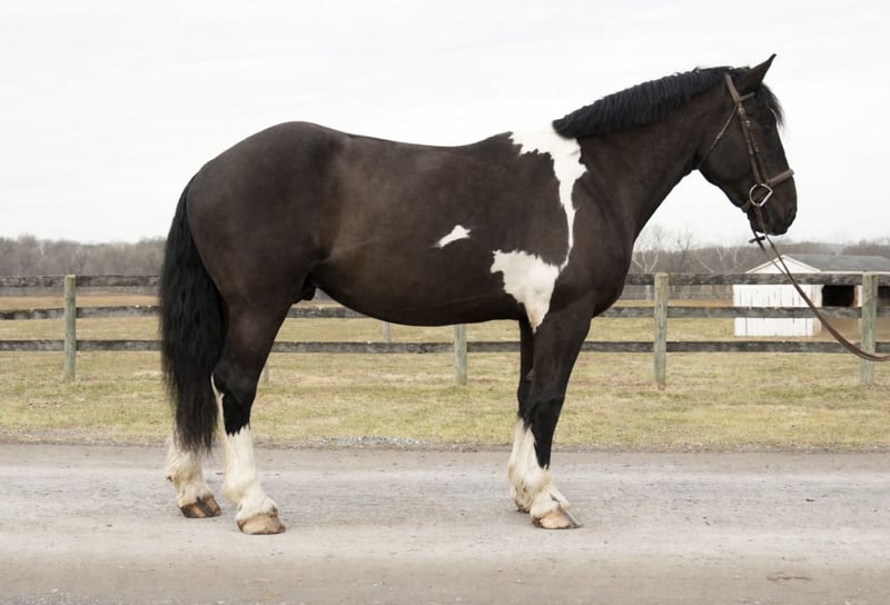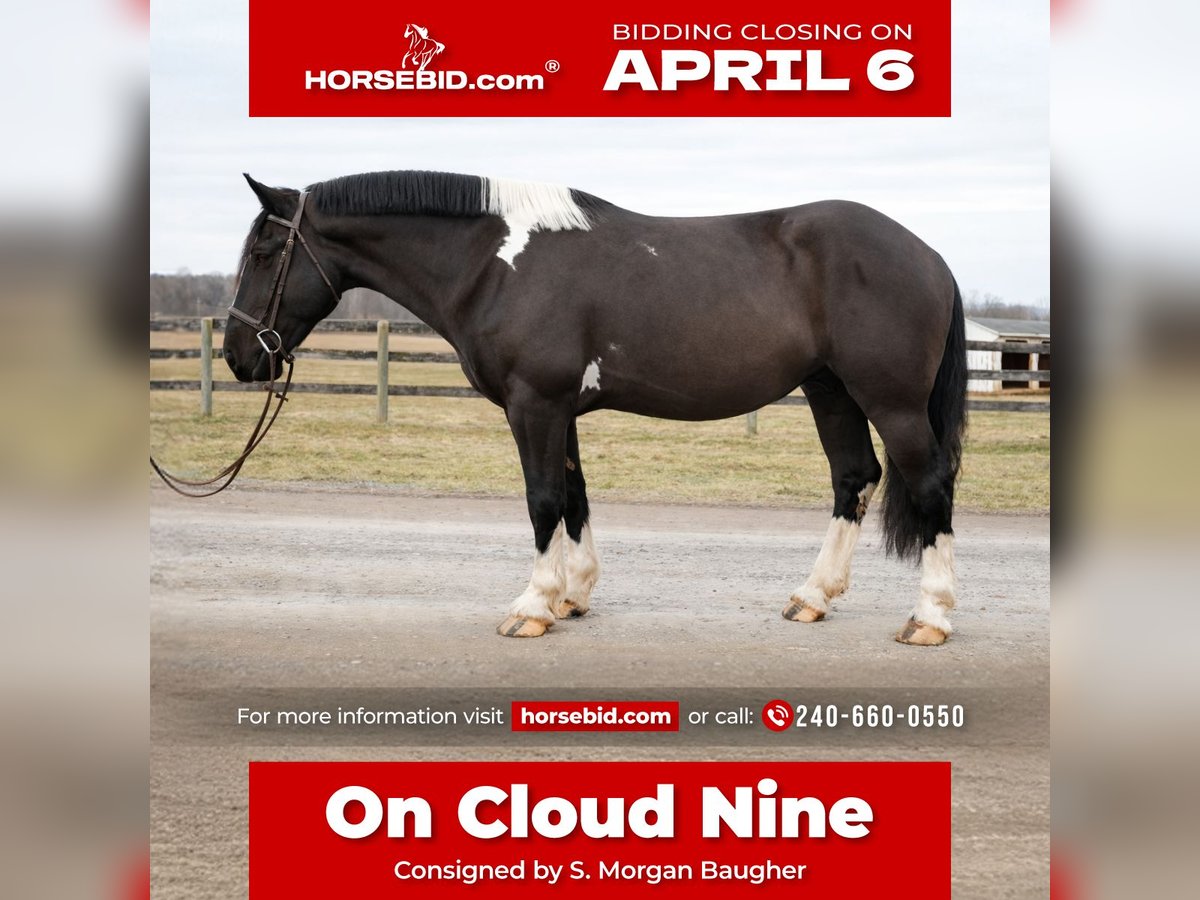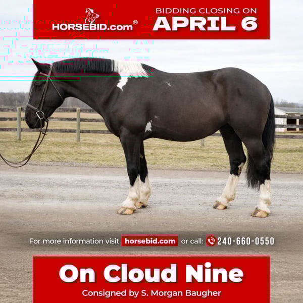🌟𝑨𝒑𝒓𝒊𝒍 𝐀𝐋𝐋 𝐒𝐓𝐀𝐑 𝐋𝐈𝐍𝐄𝐔𝐏🌟 Happening now thru MONDAY | APRIL 6th - Available EXCLUSIVELY on HorseBid's website! For more details and to register visit: www.Horsebid.com CONSIGNOR CONTACT: S. Morgan Baugher 240-660-0550 LOCATION: Tuscarora, MD BREED: American Spotted Draft Horse REGISTERED: No COLOR: Pinto HEIGHT: 17 AGE: 5 GENDER: Gelding “On Cloud Nine” “Cloud” is a 17.0hh, 5 year old American Spotted Draft horse. He’s handsome, loving, and a joy to ride. From the moment you lay eyes on him, you will understand how special he is. You will gain confidence with having a steady and dependable partner. He’s a real steady-eddy type - not spooky and takes everything in stride. With Cloud’s size and easygoing temperament, he can be enjoyed by riders of all ages and levels of experience. Whatever job you ask of him, he always does it willingly and sensibly. Horses with Cloud’s temperament and versatility do not come along often. This is your chance to get a truly special horse to enjoy for decades to come. Cloud is smooth and comfortable to ride. He is more woah than go but has all the buttons to pick up the pace when asked. He is very balanced and uphill, so you can ride along for hours comfortably. He is a true confidence builder, good for newer or nervous riders. He also is stunning to look at, with feathered feet and flashy paint coloring. He turns heads wherever he goes. Cloud has been ridden English, Western, bareback, and double, and he is game for anything, anytime. Cloud is very seasoned on the trails, in the ring, and out on the town. He is calm and levelheaded no matter the situation. He has crossed bridges, waded through creeks, traversed logs and ditches, and passed cars on the road, all without hesitation and with a confident attitude. We live next to a gun range and train tracks, so he is desensitized to those noises. He’s been a steady trail partner for riders of all experience levels. He rides out alone or with others. He’s also taught beginner lunge line lessons and carried experienced riders around for dressage lessons. He is the kind of horse you can pull out anytime, put anyone on, and have a blast and feel comfortable with him. He is fully acclimated to the hustle and bustle of a busy farm with heavy equipment, dogs, children, small animals, and traffic around him. Cloud does not mind toy wagons, balloons, flags, or ropes. He is up for any adventure, whether you want to foxhunt, event, take lessons, trail ride, event, show, or just hang out at home. He is patient with new riders and adapts to help his rider advance. He can help you safely reach your goals as a rider. Cloud rides both English and Western, and is responsive to leg, seat, and voice cues. His foundation is rock-solid: knows all his cues, always picks up the correct lead, and knows lateral movements. He has three smooth, adjustable gaits and jumps over fillers and natural obstacles. He has a soft mouth and consistently offers a pleasant disposition. He is good for kids, beginners, husbands, etc. Cloud is the same horse whether you ride him every day or once a week. He does not need a strict program. What makes him a standout is his patience and dependability. Cloud could go in absolutely any direction - from a fancy trail horse to a mounted patrol horse, therapy horse, ranch partner, fox hunter or hill topper, or dressage mount. On the ground, Cloud is very sweet and cuddly. Never pushy but enjoys attention and wants to be with you. He loves getting brushed, having his hair braided, and being told how handsome he is. He would probably come in your house and watch a movie with you if he could. He partakes in family trail rides, family snow day adventures, and trips into town. Cloud is also exceptionally well behaved around the barn. He is stands for the vet and farrier. He picks up all four feet with ease and is good for bathing, clipping, and all the barn activities. He stands quietly in cross ties until you are ready to ride. He happily lives in or out. He loads and hauls exceptionally well and is sensible in new environments (see him walking through Tractor Supply). No maintenance or supplements. He’s an easygoing and low-maintenance kind of guy. He is a real heartthrob. This is the family-friendly wunderkind that people spend years searching for. We can help with shipping anywhere. PPE's Welcome. Watch His Video and contact Morgan for any additional questions.