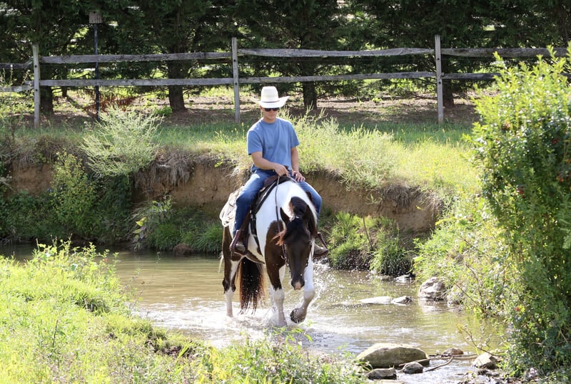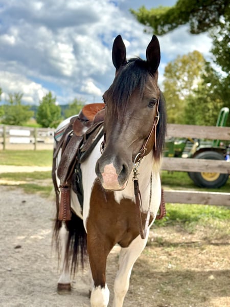 "AVAILABLE ON ONLINE HORSE AUCTION AT www DOT MagicHorseAuction DOT com BIDDING OPEN NOW thru TUESDAY | September 16TH! - BUY IT NOW AVAILABLE! *Final price will be determined on auction site* CONSIGNOR CONTACT INFO: Juli Hubik 717-875-2061 LOCATION: Gap, PA Meet Sánchez, a 4-year-old, 15.1–15.2hh Draft/Paint cross gelding, a.k.a. Mr. Adorable Tank on Four Legs. This compact cutie is built like a brick house and has the personality of your favorite golden retriever. He’s the kind of horse that makes you smile every time you see him — and he knows it. He’s got solid conformation, like “could survive the apocalypse” solid, but without being a skyscraper. He’s the perfect height for those of us who like our horses to be sturdy and substantial — but not so tall that you need a parachute to dismount. He takes up leg beautifully and rides both English and Western, because why limit yourself? In the arena, Sánchez is that magical combination of comfy and uncomplicated. He stands patiently to be mounted — block, ground, whatever — and once you’re on, he’s got a walk-trot-canter that feels like riding a couch made of clouds. His trot is easy to sit (yes, really), and his canter? So smooth you’ll forget about your to-do list and start planning your next trail snack. He’s got a shorter stride, which means tight circles are no problem — and you won’t feel like you’re driving a stretch limo. He’s responsive, but not reactive — just the right mix of “let’s go” and “chill out.” You don’t have to constantly nag him to move, but you can put a leg on without getting launched into space. He stops like a pro with a little seat and a “whoa,” and his brakes work better than most luxury cars. Sánchez is basically the Swiss Army knife of horses. Want to dabble in dressage? Go for it. Try some jumping? Sure. Hit a hunter pace? Absolutely. Or maybe you just want a best buddy for trail riding and barn gossip — he’s your guy. On the trail, he’s a total gem. Front, middle, back, solo — you name it. He’s been through creeks, rivers, woods, and wide-open fields like he’s auditioning for a nature documentary. He’s brave, steady, and probably more reliable than your GPS. He’s even taken beginner riders out for a spin and kept things cool, calm, and collected. He’s popped over tiny logs in the field like a saint, knees up, ears forward, and zero drama. This guy loves going new places — he’s basically the horse version of that friend who always has their bag packed for a weekend trip. Load him up, and he’s ready to go, ears perked and wondering if there will be snacks. Desensitization? Oh, he’s done it all. Fire? Check. Traffic? No problem. Tarps, balls, smoke bombs? Bring it on. While he’s not a total deadhead (he does have a brain), he’s not spooky — more curious than anything. If something startles him, he does a little blink, shrugs it off, and keeps on trucking. In the barn, Sánchez is a gentleman. He minds his manners, respects your space, and plays nicely with the other horses. He stands like a champ for grooming, tacking, and farrier visits. He picks up his feet without fuss and never turns into a pushy brat. At first, he might seem a little stoic — like a mysterious cowboy in a movie — but give him a minute, and suddenly he’s your best friend, rooting through your pockets for peppermints like a seasoned treat detective. We truly love this young guy and believe his future is super bright. That said, he is still young and learning, so he probably isn’t ideal for a complete beginner unless they’re working with a trainer who can help guide him on his path to world domination — er, success. We want a home for him where he’ll be appreciated, loved, and maybe occasionally spoiled with cookies. Because let’s be honest — this horse is kind of amazing.