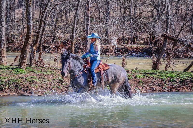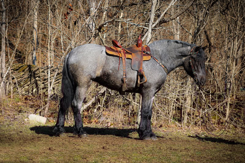 ONLINE AUCTION Place your bids at www.PlatinumEquineAuction.com Starting Bid $3500 Auction ends February 23rd, 2025 Need a new saddle? Check out White Rock Saddles on our website or Facebook! This is “MISS APPALACHIA”, a gorgeous, stout made, smart, strong yet gentle, well trained TRUE BLUE ROAN BRABANT MARE that is broke to ride and drive. This mare is not only well built with really cool color, but extremely intelligent, civilized, and nice to be around. She stands 15.3 hands tall and is 4 years old. She has been ridden English and Western in the indoor arenas and outdoor arenas. She has been out on the trails, through the water, ridden in the thick brush, through mud, ice, and snow. She has been on rocky mountainous terrain and handles it well. She is sure footed and stays in four wheel drive. It will not get too deep or too steep for her. We have taken her through the cross country driving courses and she will cross water quietly under tack or harness. She is brave, honest, solid, and sincere. She has been driven on the roads, in a few parades, and she is traffic safe. She is responsive and fun to ride with a big solid stop. She backs up and is loping circles in the arena. She will also ride out in the open and lopes off quietly with no hump and no buck. She stands to harness, hitch, tack, mount, and groom. She aims to please and has a great personality that makes her a pleasure. She is versatile, will hook up and work, drive a cart or wagon, and tack up and ride off nicely. Don’t miss out if you want a big cool TRUE BLUE BRABANT. Located in Flemingsburg, KY. For more info or to make a BUY IT NOW offer contact HH Horses Erin 304-238-4155. ONLINE AUCTION Place your bids at www.PlatinumEquineAuction.com Starting Bid $3500 Auction ends February 23rd, 2025 Need a new saddle? Check out White Rock Saddles on our website or Facebook!