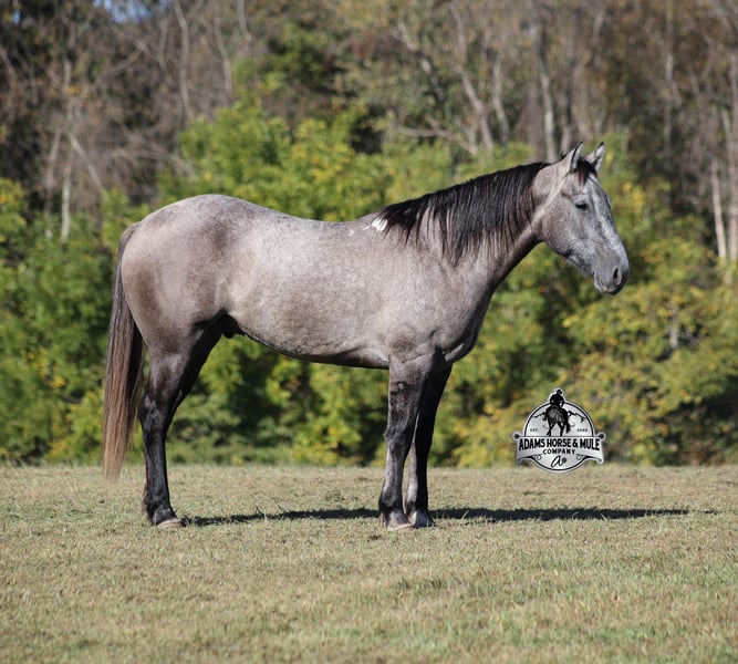 Go to visit our website for more pics and a video www.AdamsHorseAndMuleCo.com AHAMC has been in the horse business and sold horses over the internet since 2005. We have a long track record of success with hundreds of happy customers. We work hard to match riders with the correct horses and specialize in beginner safe, family friendly horses that have been used and checked out by our family! We can set up transportation anywhere in the US and look forward to working with you.If your confidence levels are low and you have had nothing but bad luck with you other horses… just say goodbye to those days because Ashton is going to fix all of that! Ashton is a beautiful grey/dun Gelding that is very stocky built, he is 5 years old, is standing 15hh and he has the coolest tiger stripes on his legs and dorsal stripe down his back! He is 3/4 Quarter Horse and 1/4 Percheron Ashton has completed the natural horsemanship program and he is very friendly and loves attention!! He knows some tricks as well as he will lay down on command. Ashton has done it all from being ridden by small children down the highways to being ridden around the ranch, checked cows, rode fences and cruised the trails. He has been used at brandings and drug calves to the fire and has been pasture roped off of as well. He is a laid back type of guy that will just plod along down the trails with no hesitation and not in a hurry. He has been on camping trips and has been ridden by all ages of riders from 6 to 86 that guy will be safe and easy to ride. When out on the ranch or going down the trails he will cross creeks, ditches, logs and navigate rough, rocky areas. He is safe in traffic whether that be trucks or cars. He walks on a loose rein, has a nice jog, his lope is slow and collected plus he lopes very nice circles on a loose/draped rein! Our kids have ridden him bareback around our arena, taken him bareback down the trails and through the creeks… this horse is the ultimate family horse! He has been exposed to all kinds of wildlife such as deer or turkey. He is athletic and would be a great horse to put under English tack to go over the rails with. He pastures well with others and rides the same after time off. Ashton is one that the whole family will love, he will be perfect for the guest to ride as he will build his riders confidence, with a personality that will make him everyone’s best friend! Feel free to call Eric 606-308-2461 with any questions!
