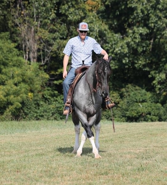 Poncho is as cool as he is different! This draftcross gelding stands around 15.3hh that will weigh around 1400lbs and he is a 5 years old. Poncho is a rare blue roan tobiano!!! Poncho is everyone’s best friend as he loves attention and is very calm natured. He is out of the same breeding program as several other top draftcross geldings that we have had over the last 5 years and every one of them has the right mind with the calm nature that makes them great family horses. Poncho has been ridden by every member of our family all the way down to our 7 year old daughter. He has been ridden down the highways and he is traffic safe as well. Poncho is great on trails and he will cross creeks, ditches, logs and navigate rough rocky areas. He has a smooth jog, a VERY VERY nice easy to set lope and a good stop! He neckreins around and backs with ease. He has been exposed to all kinds of wildlife such as deer or turkey or other animals like cows or dogs and will go anywhere that he is asked too. He has been ridden many miles in the mountains of Eastern Kentucky and encountered every obstacle possible on the trail. He will go up or down even the steepest slopes, across deep creeks, over downed trees, and over all types of rough terrain while still being sure footed. Poncho is not cinchy, cold backed, does not crib or weave. In addition to riding, Poncho has also been worked in farm machinery as well. He is the horse of a lifetime, don’t miss him!!! Feel free to contact me +13039908552