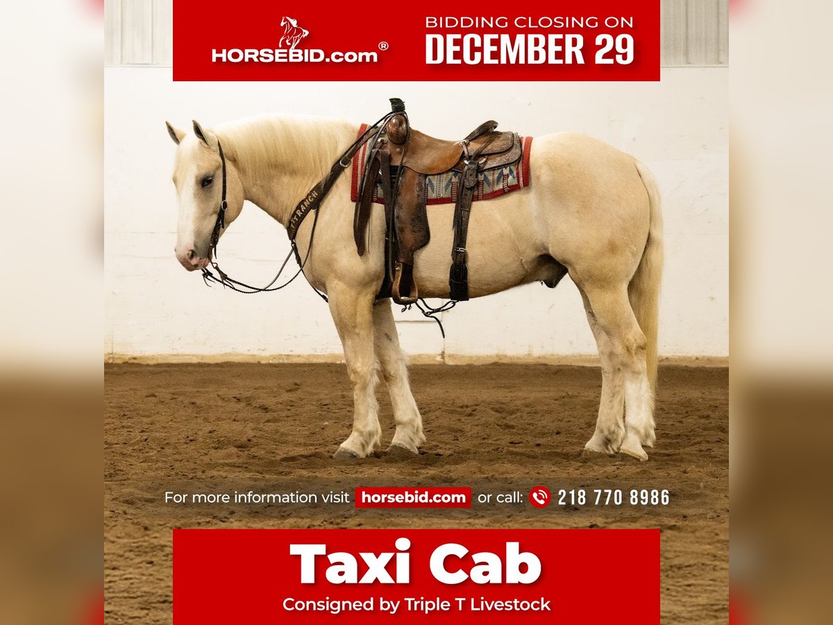⚜️ 𝓗𝓮𝓻𝓲𝓽𝓪𝓰𝓮 𝐖𝐢𝐧𝐭𝐞𝐫 𝓒𝓵𝓪𝓼𝓼𝓲𝓬⚜️ Happening now thru MONDAY | DECEMBER 29th - Available EXCLUSIVELY on HorseBid's website! For more details and to register visit: www.Horsebid.com CONSIGNOR CONTACT: Triple T Livestock 218 770 8986 LOCATION: Nevis, MN BREED: Draft Cross REGISTERED: No REGISTERED NAME: Taxi Cab COLOR: Palomino HEIGHT: 16 AGE: 5 GENDER: Gelding Taxi Cab is a hard-to-find 16-hand draft cross gelding with eye-catching palomino color and a bold blaze that makes him stand out wherever he goes. At five years old and weighing around 1,400 lbs, he has the size, bone, and presence people search for in a big, versatile gelding. He is broke to both ride and drive, offering excellent versatility for a variety of homes and jobs. Under saddle, Taxi Cab is a smooth, comfortable mover with an easy, balanced jog and a soft, smooth lope that’s enjoyable to sit. Taxi Cab is traffic safe, confident around commotion, and takes new situations in stride. He rides bareback, handles tarps quietly, and stays level-headed whether you’re in the arena, out on the trail, or around busy environments. His draft cross build gives him a solid, secure feel that riders appreciate. If you’re looking for a young, good-minded big gelding that’s broke and versatile, Taxi Cab checks those boxes.