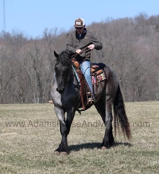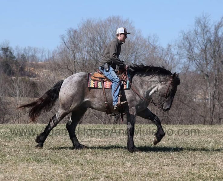 Go to visit our website for more pics and a video. AHAMC has been in the horse business and sold horses over the internet since 2005. We have a long track record of success with hundreds of happy customers. We work hard to match riders with the correct horses and specialize in beginner safe, family friendly horses that have been used and checked out by our family! We can set up transportation anywhere in the US and look forward to working with you.Ponch is an awesome looking 16.1h, True Blue Roan Draftcross gelding! He is 5 years old and is a sturdy built horse. Ponch came from the same breeding farm that a lot of our draftcrosses come from and with that farm we find the constant quiet, gentle, laid back temperment that makes them such good family safe trail horses! Ponch is no exception to that statement as he is a super quiet, gentle, laid back type of horse that is going to suit any rider and help build your confidence. Not to mention he is very friendly as well! Ponch can do a variety of things from pulling carriages, to ranch work or trail rides. Ponch has been on camping trips, been ridden in several states and has been ridden by all ages of beginners. When out on the ranch or going down the trails he will cross creeks, ditches, logs and navigate rough rocky areas. He is safe in traffic safe whether that be trucks or cars. He’s been ridden around the ranch, checked cows and rode fences. Ponch moves very smoothly, as he has a nice jog, his lope is smooth as well and he lopes nice circles on a loose rein! Ponch is blue but he will never make you blue and he is sure to be your new best friend! Feel free to call Eric 606-308-2461 with any questions! Go to visit our website for more pics and a video. AHAMC has been in the horse business and sold horses over the internet since 2005. We have a long track record of success with hundreds of happy customers. We work hard to match riders with the correct horses and specialize in beginner safe, family friendly horses that have been used and checked out by our family! We can set up transportation anywhere in the US and look forward to working with you.