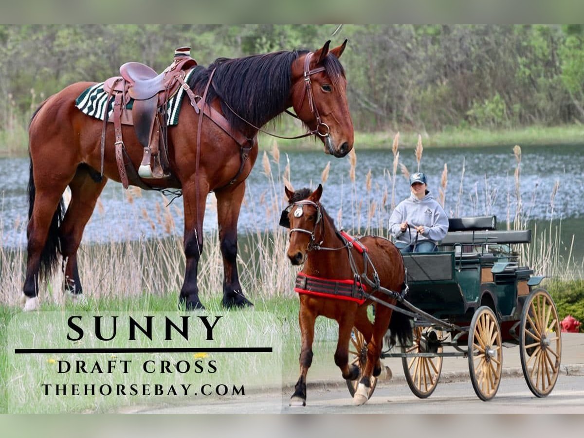OPEN BIDDING ON THEHORSEBAY,COM. SALE ENDS ON 05/22. More information is available on the website, including an UTD vet inspection, Coggins, video, images, and the owner's contact information to ask questions, request information, or make arrangements to come to visit. Meet Sunny he’s a 5 year old 16.2 hand Draft Cross Gelding. He RIDES & DRIVES! And he’s safe both ways. He’s a gentle giant with the personality of a big puppy. He’s super sweet and has an awesome disposition that’s hard to beat. DRIVING… He stands excellent for hitching, stop signs/lights, and getting on/off the cart. He doesn’t mind traffic one bit he’s had big semis come up behind and from the front. He’s used to fast busy traffic. He crosses any and all bridges. I don’t have it on video, but he has crossed a bridge that has a dam letting water out and it’s quite a loud roar. He’s seen all traffic big and small from the motorcycles up to the big tractors. He’s had dogs come out barking at him down the road and he doesn’t care one bit about the flags flapping in the wind overhead. He doesn’t look at anything on the side of the road. He has been there and done that so he’s very safe for driving. As long as you know how to drive you should get along just fine with him, he’s pretty easy to control. And he knows the voice commands easy, whoa, walk on, trot, and back. We normally just trot under harness, but he will pick up a nice lope in the cart if you ask him to. RIDING… For riding he’s just as good he’ll go pretty much anywhere you point him. He DOES NOT spook easily. He has seen all the wildlife and doesn’t care a bit. He’s had deer jump out… he’s had turkeys fly over his head…and he’s been the barrier between a standoff with a porcupine and his stupid dog tramp. So, he’s very good with wildlife and doesn’t mind riding with a dog. Tramp is constantly lagging behind then charging up behind Sunny out of nowhere and Sunny never bats an eye at him. He will go in any kind of water puddles, creeks, lakes, etc. He is a powerhouse when it comes to the steep hills up or down, he takes them like they are nothing. He also will pony other horses no problem. He can ride out alone or in a group either front or back. He’ll separate out on the trail. One thing I’ll say about him that impresses me is that he takes care of his rider. He’s very safe and gentle yet fun and not boring and he always takes care of his rider. He has a very level head and a very been there done that attitude and he’s young so he can only keep getting better. ARENA He knows arena work unlike most trail horses he’s big but he’s agile and can canter a small circle with ease. He has a couple different gaits. He can do a slow jog trot or an extended trot. He can do a slow little quarter horse canter or a more extended canter. But no matter which gait he’s doing it’s smooth. He has a nice rolling canter that is very easy to sit to. He knows his leg cues to move his shoulders and hind quarters and stops off your seat. He also knows both leads and will pick them up off of a walk. He can ride western or English. He’s mostly ridden western but has been ridden with some English tack. GOUND MANNERS He stands great for the Farrier, getting tacked, mounting, and he knows the come over cue, so he’ll sidle over to wherever you are to get on. He’s easy to catch and knows his name. Once he connects with you, he likes to follow you around like a big puppy. We have been working on the command stay which is hard sometimes because he loves the idea of follow. He’s an easy keeper, but he does like to eat he is very food motivated. Gets along well in the herd doesn’t matter mares or geldings. Loads in the trailer and backs right out. He hauls quietly. He’s pretty easy to get along with. Has NO bad habits or vices. I would call him husband safe or wife safe depending on which spouse is the lesser rider. Or he could work for an advanced beginner someone that has had lessons or will take lessons with him, so they know how to ride and handle a horse. He’s basically a been there done that gelding that takes care of his rider/driver and is safe as long as you know how to ride you should get along just fine with him. He’s a one owner too so there is NO unknowns with him we have his entire history. He was born and raised on the farm. Anyone that has driven or ridden him loves him. He gets lots of complements wherever he goes. It’s hard to miss him with his big stature and his deep red coat, but he mostly wins people over with his personality. He’s big enough to carry or pull a heavy load, but he’s gentle enough for shorter person like myself. To sum it up you can’t go wrong with Sunny and to meet him is to love him. So, you’re welcome to come meet him or call with any questions.