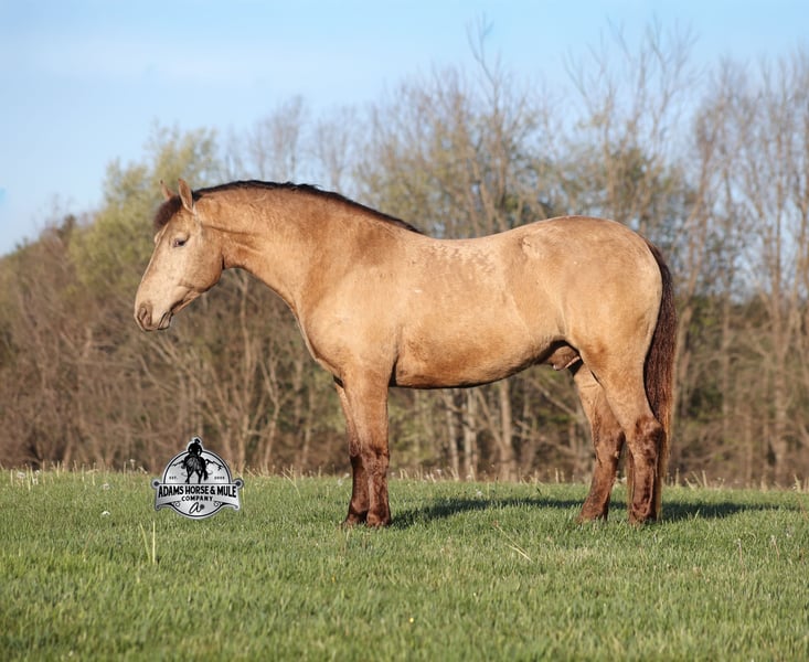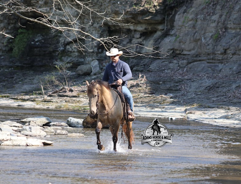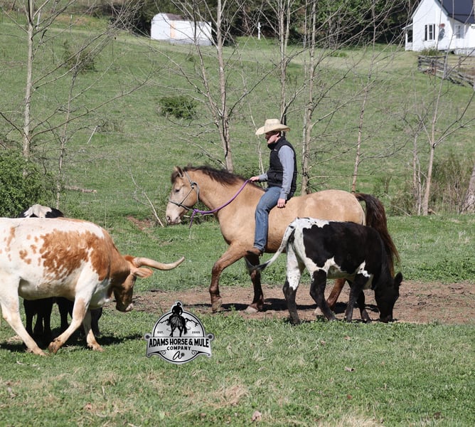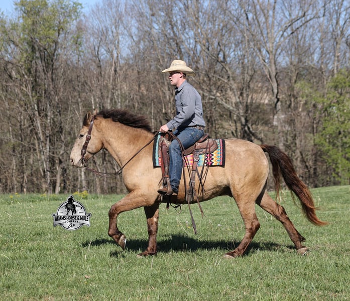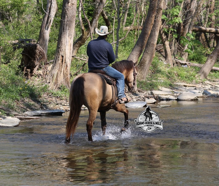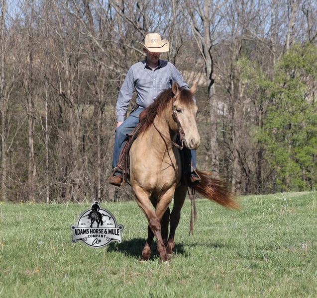 Go to visit our website for more pics and video link at www.AdamsHorseAndMuleCo.com AHAMC has been in the horse business and sold horses over the internet since 2005. We have a long track record of success with hundreds of happy customers. We work hard to match riders with the correct horses and specialize in beginner safe, family friendly horses that have been used and checked out by our family! We can set up transportation anywhere in the US and look forward to working with you. It’s time for a celebration… pop the champagne with this magnificent 15.2H+, ULTRA RARE Champagne Draftcross gelding! He is 6 years old and is VERY sturdy built. Jagger is one that is not only a rare color but rarely do we see one that is this beginner safe, a total confidence builder and one that is the PERFECT horse for the ENTIRE Family! He has been ridden by all ages including our kids. Jagger is one that does a little bit of everything… He’s been ridden around the ranch, checked cows and rode fences. Jagger is a trail riding machine!!! He is never in a hurry as he eases along down the trails, he will cross creeks, ditches, logs and navigate rough rocky areas. He picks the safest route and takes his time in tight situations. He has been exposed to all kinds of wildlife and has even packed will game out of the mountains. He is safe in traffic whether that be trucks or cars. He has a nice jog, his lope is smooth as well and he lopes nice circles! He is very well harness broke, pulls all farm implements and carriages as well. Jagger has been ridden English and geos over the rails with ease. This one horse that we can never say enough good things about and after he becomes part of your family your will agree! Feel free to call Eric 606-308-2461 with any questions!