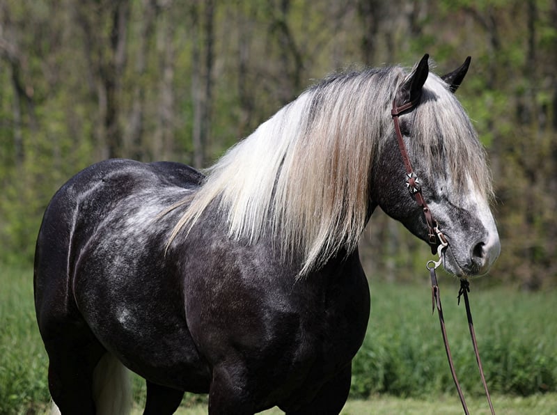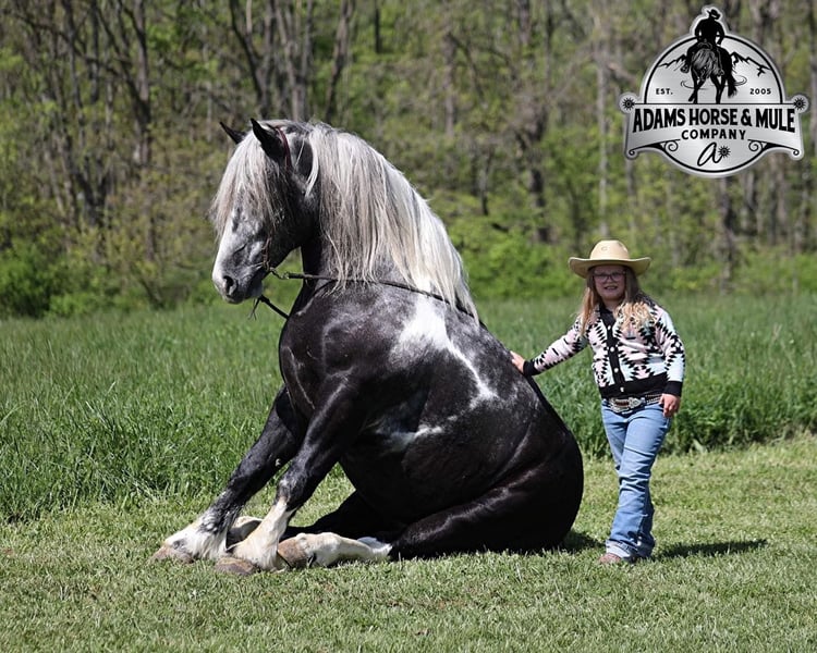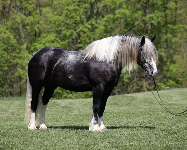 Consigned to Cowgirl Cadillacs in Sheridan, WY. Sales June 14-15th. You can bid online, phone bid or bid in person! With movie star good looks, muscles upon muscles and that long flowing hair you’d expect to see Slate on a Hollywood movie screen. Slate a stout built, 16H, 6 year old, grey tobiano draft-cross (paint/ quarter horse/ percheron) gelding that stands 16H tall. He is trained to lay down and sit, on command. Slate is everyone’s best friend and he loves attention. He has been used around the ranch and can pull anything that you can throw a loop on. If a mad momma cows pushs on him, he will just stay calm and push right back. The kids have ridden him around the ranch and checked cattle on him. He has seen the bright lights, heard the loud speakers and the roar of the crowd at the rodeo while shagging bulls from the arena. He has also been drove down the highways under harness and is traffic safe. Slate has a smooth jog, takes his leads and will lope as soft and slow as horses half his size! He has a good stop, sidepasses to open/shut gates and backs with ease. Slate has been exposed to all kinds of wildlife, he has been used in the mountains for hunting and has packed game. Slate is great on the trails, he picks his way through rocky terrain, crosses deep water, scales slopes with ease and walks across deadfall as well. If you need to feel safe and secure just hop on Slate and enjoy the ride, you will soon see that there is a lot more to this guy that what meets the eye! Call 606-308-2461 for more info.