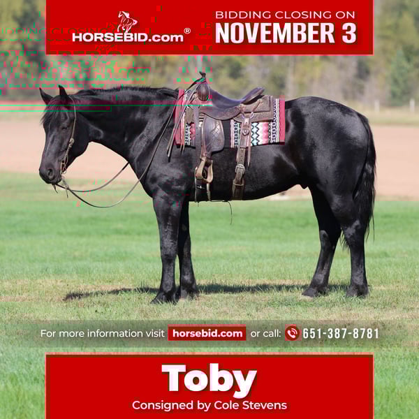 ⚜️𝐓𝐇𝐄 𝐅𝐀𝐋𝐋 𝐇𝐄𝐑𝐈𝐓𝐀𝐆𝐄 𝐂𝐋𝐀𝐒𝐒𝐈𝐂⚜️ Happening now thru MONDAY | NOVEMBER 3rd - Available EXCLUSIVELY on HorseBid's website! For more details and to register visit: www.Horsebid.com CONSIGNOR CONTACT: Cole Stevens 651-387-8781 LOCATION: Riverfalls, WI BREED: Crossbred REGISTERED: No COLOR: Black HEIGHT: 16.3 AGE: 6 GENDER: Gelding Everyone always calls looking for a big pretty crossbred well we finally have one and he checks all of the boxes! Toby is a 6 year old crossbred gelding that is jet black, stands 16.3/17 hands and has been used for anything and everything that we can put one through. Toby has had every job on the place, we have used him to gather and doctor yearlings, taken him on trail rides and there isn’t anything that bothers him. He is point and shoot! Toby rides in and out of the arena, and he will lope around like a quarter horse. He is very good leaded and one hand broke, he even rides bridleless. He has also been ridden English, so if you’re wanting to ride English or western it makes no difference to him, he is just along for the ride and looking to please. Before coming to us he was used to the rodeos as a flag horse and also used to clear cattle out of the arena, he has seen the lights and the music in front of the big crowds! He is gentle and stays that way he has a huge personality and always wants to be your friend. There really isn’t a job to big or to small for this gelding. Don’t miss out on this super nice gelding, he will stand out no matter where he goes. He is ready to go to his next home where someone can use and enjoy him. Toby has great feet and is as straight and clean legged. If you have any question feel free to call me at 651-387-8781. He is offered exclusively on Horsebid.com!