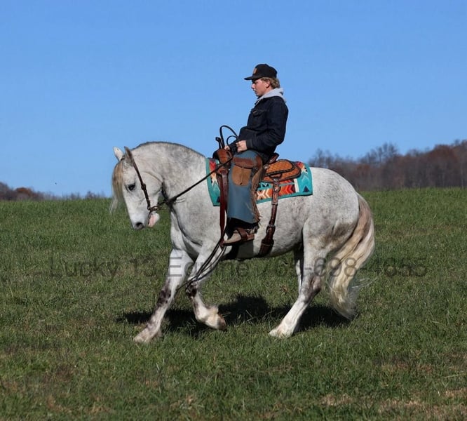 ONLINE AUCTION Place your bids at www.PlatinumEquineAuction.com Starting Bid $3500 Auction ends January 12th, 2024 Need a new saddle? Check out White Rock Saddles on our website or Facebook! Action Jackson is always ready for lifes next adventure! With his contrasting dapple grey coloring, that long flowing mane and tail or his sweet personality… he sparks folk’s attention from all angles! Jackson is a well built 15.2hh, 2018 model, Grey Draftcross Gelding. MAKE SURE TO WATCH HIS VIDEO!!! His name might suggest that he’s just here for adventure and he knows how to go to a job but if a relaxing ride is what you are looking for, then that is exactly what he is wanting to do! Jackson can do anything from slow easy trail rides, pack the medicine bags while pasture roping/doctoring (hundreds of cows/calves as he has), he can push the cows around and hold anything that you tie to the horn. Jackson stands patiently and keeps the rope tight while you work the calf out in the open. If you want to come out of the box, Jackson can turn a steer and has been started on the head side. If you just want to enjoy those long slow miles on the trails with your friends, Jackson is perfectly content to just mosey along slow and easy. He will cross creeks, deadfall, rough rocky areas and scale steep slopes. Jackson is one hand broke, he reins around with ease, has a big stop and lopes very nice circles on the correct lead. Jackson is easy to ride and is safe for all levels whether you use him daily or once a month. Jackson is the type of horse that will keep grandma safe and make her feel like a cowboy all at the same time! Climb on, set back and enjoy all of the action on Jackson! Feel free to call with any questions, to set up a time to come see him or to make a buy it now offer… Lucky 13 Equine Matt 765-698-4655 or Lysandra 765-717-2041. ONLINE AUCTION Place your bids at www.PlatinumEquineAuction.com Starting Bid $3500 Auction ends January 12th, 2024 Need a new saddle? Check out White Rock Saddles on our website or Facebook!