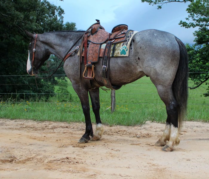 ONLINE AUCTION Place your bids at www.PlatinumEquineAuction.com Starting Bid $3500 Auction ends June 23rd, 2024 Need a new saddle? Check out White Rock Saddles on our website or Facebook! Indigo is a 7 year old BLUE ROAN draftcross gelding, He stands 16.1 hands tall and is a gentle giant! Indigo has been used for a little bit of everything! He has been trail rode all over, been hauled to state parks, he has been hunted off of in the mountains, he has also been packed off of. Indigo does great in any type of terrain, He crosses the creeks, bridges , and logs with no hesitation. Indigo has also spent countless hours on the ranch and in the sale barn doing all aspects of ranch work. He has been used to rope and doctor cattle outside, he has also been used to gather and sort cattle. Indigo has been used at the sale barn for pushing and sorting cattle as well! Indigo is super gentle and quiet, he has a sweet puppy dog personality and wants to be everyones friend! If your looking for a fancy crossbred that you can do anything on be sure to check Indigo out! He is located in Rusk TX, Nationwide shipping is available! Call or text TR Livestock Rachel 605-370-4644 for more info. ONLINE AUCTION Place your bids at www.PlatinumEquineAuction.com Starting Bid $3500 Auction ends June 23rd, 2024 Need a new saddle? Check out White Rock Saddles on our website or Facebook!
