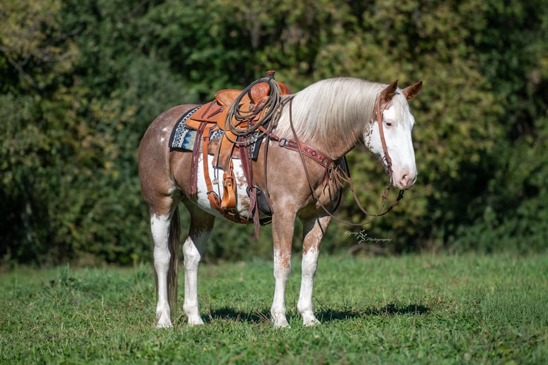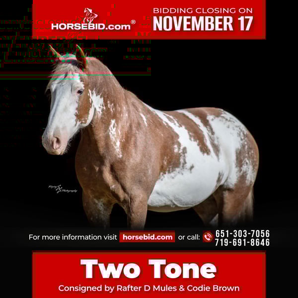 🎲𝓽𝓱𝓮 𝐑𝐈𝐃𝐄𝐑'𝐒 𝓒𝓱𝓸𝓲𝓬𝓮🎲 Happening now thru MONDAY | NOVEMBER 17th - Available EXCLUSIVELY on HorseBid's website! For more details and to register visit: www.Horsebid.com CONSIGNOR CONTACT: Rafter D Mules & Codie Brown 651-303-7056 and 719-691-8646 LOCATION: Hastings, MN BREED: Draft Cross REGISTERED: No COLOR: Red Roan Sabino HEIGHT: 16 AGE: 10 GENDER: Mare Uncommon in every way and outstanding in the very least; all while being as handy and safe as they come. Two Tone is a well-rounded mare that has a variety of jobs on her resume. She has been in our program for several years, as she was owned and trained by Codie. Many of the photos you will see were taken throughout the years of owning her. Two Tone was trained and used in the feed yards; she can rope and hold anything you are brave enough to catch. She has been used to pack in a pack string and has also led pack strings through the switchbacks in and out of camp. She is broke to hobble and has been on many overnight camps. Two Tone has been trail ridden through the wide-open country and the mountains. As if that is not an extensive enough resume... She has also been used as a pickup horse in rodeos where she picked up cowboys off of broncs and shagged bulls. She has had the privilege of carrying our nations flag at the rodeo during the national anthem in front of a packed audience. Two Tone has been ridden by cowboys and cowgirls, by riders who are young and old, from the least experienced to the most. This mare has been a true pleasure to own, and we are excited to see her give the same great experience to someone else. Her disposition is phenomenal, making it incredibly easy to say that she is as pretty on the inside as she is on the outside. One glance at her is all it takes to know that this mare is capable of turning every head! Two Tone hasn't just been trained; she has had years of experience where she has been ridden miles throughout the nation. Though she rides great inside, she has all the experience and confidence to ride outside doing any job or casually trail riding. You can leave her off for months and have no concern about cinching her up and riding off. She is going to give you the same great ride every time with complete consistency. No matter who you put in the saddle, Two Tone is going to take care of them, and go any direction she is pointed. She will side pass across an arena, correctly take her leads on cue while loping pretty circles, has an impressive extended trot, a big stop and a nice turn around for a mare of her size. She has athletic ability that is much more comparable to a quarter horse than a draft horse. She is an easy keeper, loads and hauls well, stands for the farrier, and is easy to catch. Two Tone gets along well whether she is stalled or turned out. She pastures well with other mares or geldings and is not marish whatsoever. She is easy going no matter what you ask of her. Whether she is getting a bath, or riding through the creek, she loves water! She has even raised a baby that was just as good looking as she is, with all of the jaw dropping color. There really isn't anything that this mare is not capable of. If you have questions about Two Tone or would like to meet her prior to the auction ending please contact Dillon at 651-303-7056 or Codie at 719-691-8646. We want to make sure that she gets the best home, so please do not hesitate to reach out! She is truly the mare of a lifetime, and whoever gets her, will love her just as much as we have.