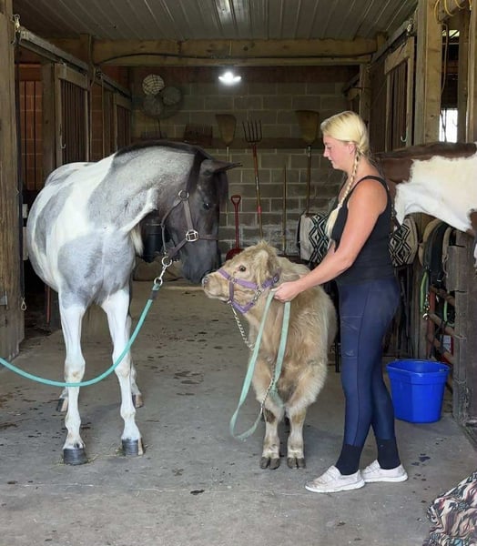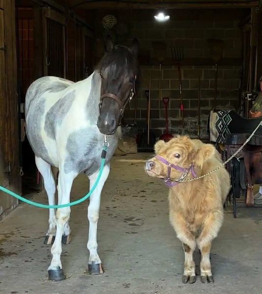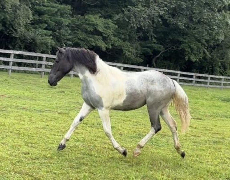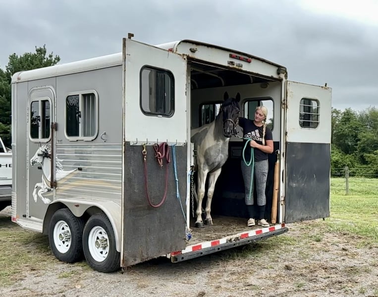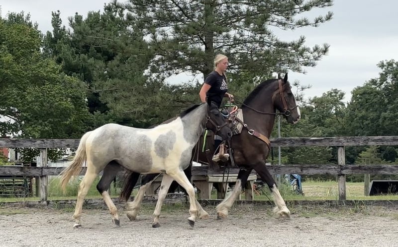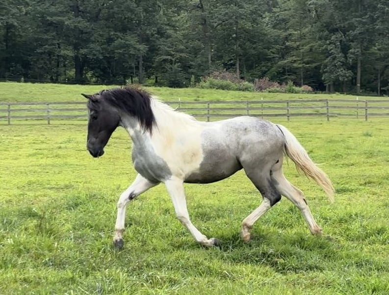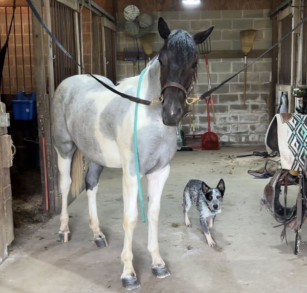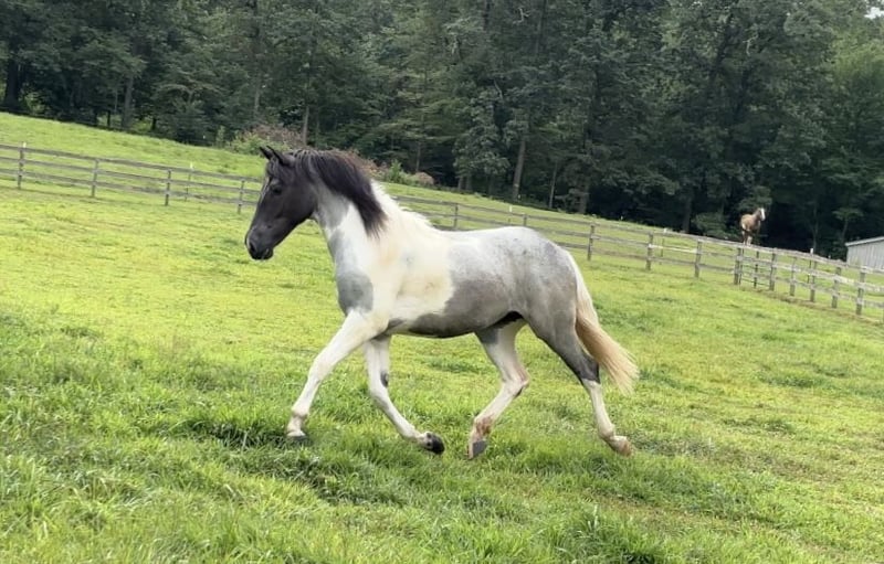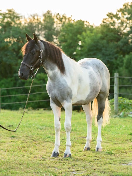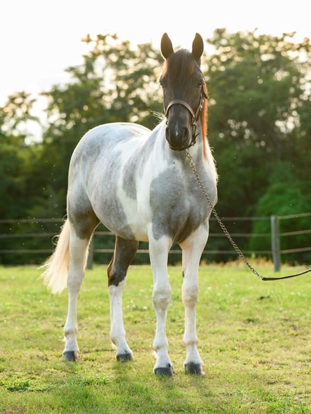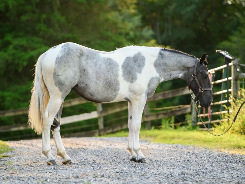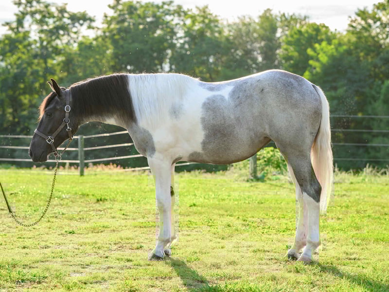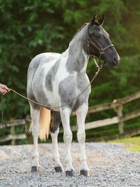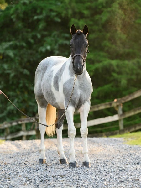 "AVAILABLE ON ONLINE HORSE AUCTION AT www DOT MagicHorseAuction DOT com BIDDING OPEN NOW thru TUESDAY | SEPTEMBER 2ND! - BUY IT NOW AVAILABLE! *Final price will be determined on auction site* CONSIGNOR CONTACT INFO: Roni Renee 610-806-2613 LOCATION: Narvon, PA "“Aurora” is a Percheron, Quarter Horse cross, yearling filly, currently measuring 14.1hh at the withers and 14.2hh at her rump, foaled May 22nd of 2024. This is by far the kindest, sweetest, most laid back yearling I have ever met in my life. She is extremely in your pocket, and gentle. Aurora will be registered with the draft cross registry. Her father is a blue roan Percheron and her mother is a paint mare. Her parents are known for their good nature, which absolutely got passed down to this beautiful girl. Not only are her parents good natured, she has wonderful breeding resulting in a totally versatile, agile, filly. Aurora has a very bright future ahead of her, and someone is going to be very lucky to own this amazing horse. In the barn, Aurora has zero bad habits. She can live in or out, alone or with others. She comes running to you in the pasture for scratches and attention and will not leave your side until you exit the pasture. She wants to be your buddy, and she is a big puppy dog. With how personable she is at this age, she is going to be your best friend under saddle when it comes time. I see a loyal, intelligent horse here. Aurora stands tied quietly on the cross ties and straight tied. She is safe for kids and beginners to work with and doesn’t mind dogs running all around her. She picks up her feet, is good with fly spray, and getting a bath. She doesn’t care what you do with her as long as she gets to be involved! She adores attention! Aurora came to us with a really great brain, and a super chill personality, we have been exposing her to new things such as tarps, balls, obstacles and she took right to it like an old pro. You can’t teach a horse to have a mind like this, and if she’s this great now, she’s only going to continue to get better! Aurora can be handled by children and beginners. She has great ground manners. She is not pushy or rude and acts like an old soul. We have introduced her to crossing water, going through the woods, and doing other trail obstacles. Everything that we have thrown at this baby, she has taken with stride. She is extremely intelligent and quick to learn. In my opinion, this girl was “born broke”. Aurora is curious and wants to engage in activities. New “scary” things, you can see the thought process and watch her think it all through, then engage and enjoy it. Aurora is good for the vet and farrier. She loads and trailers well. She has zero maintenance and is an easy keeper. She is not marish at all. She can go out with mares and geldings. She is also doing well with learning to lunge! Aurora is sired by a stallion named “Blue Dollar Bill”, he is a registered blue roan Percheron stallion who stands 16.2hh. He is color tested and 6 panel N/N. She is out of an APHA mare named “Diaman H QT Apache”, who is a bay and white tobiano. She is also color tested and 6 panel N/N. Her sire is known for his keen looks, loving personality, a kind hearted nature, and balanced conformation. Her mother is also known to be gentle natured, and kind. Her mother has fantastic bloodlines. Her mother’s grandsire goes back to the famous “Doc Olena”, who was inducted into the AQHA, and NCHA hall of fame. This filly is naturally bred to be agile, athletic, gentle, and smart. Whether you are looking for a future dressage, roping, ranch, fox hunter, western dressage, cow horse, trail horse, trick horse, driving horse, this young lady has the bloodlines to go do it all, and be good at it. Here is the opportunity to own a future star. A filly with a correct start, the rest will be easy. She is going to turn heads her whole life. Everyone that meets her, loves her, including myself, I am tempted to just keep her and start her myself in the future. With that being said, scoop her up now, and start your relationship with your future riding partner early in her life! I am very impressed with Aurora, and her ability to learn, even if she isn’t sure about something. She is guaranteed to put a smile on your face, and she is a happy critter every hour of the day. I’ve never seen nor met a yearling like Aurora. I could talk about her all day long. Here she is, ready to head in absolutely any direction. She has a great foundation and will be ready to start your way. Don’t hesitate on this opportunity, they don’t come around like this often. I am very thankful for my time with Aurora, and the joy she has brought all of us!!!! For more information please don’t hesitate to reach out! Shipping can be arranged anywhere!