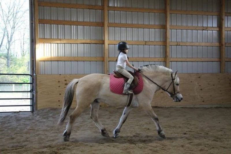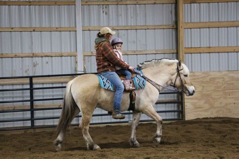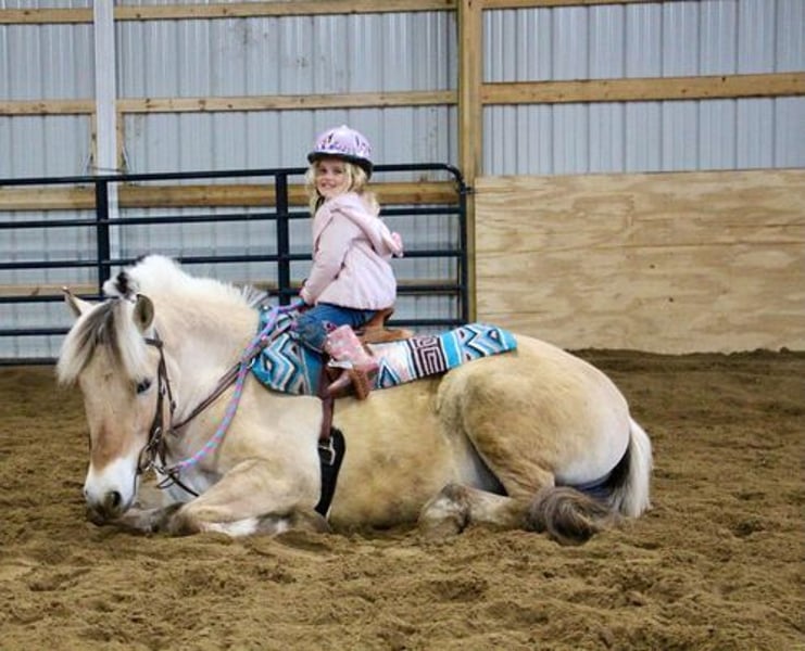 Jimmy. He is a 6-year-old Norwegian Fjord gelding Jimmy stands 14.1hh. If you know about the breed you know they are known for their quiet demeanor, versatility, and strong conformation. Jimmy is no exception to that. He is beautifully put together and is hands down the most versatile guy around. Jimmy is loaded with personality. He adores people and he knows how to lay down, sit, and say yes and no. Jimmy has been ridden on the roads, fields, and arena. He’s been used to round up cattle and rope off of. He will ride 100% off of your seat and leg cues so well that you don’t need a bridle. He will take care of any rider in any situation. We have had him out on the trails in groups of 40+ horses and he will lead or follow with the most nervous of riders, he is also great to ride out alone. He has absolutely delightful gaits this boy makes you feel like a professional every ride. He has had kids as young as 4 years old ride him independently. He is soft in the bit and responsive to all aids. Jimmy has all the natural horsemanship training you would ever expect and he soaks it all up like a sponge. He rides English, western, bareback, and even drives. He jumps full courses in stellar form with a great rhythm. He’s been to town, camping, on hunter paces and cattle drives. I think the world of this pony and could write about him all day. I would love for you to watch his video as he tells his story far better than anyone could. There’s nothing this pony can’t do!