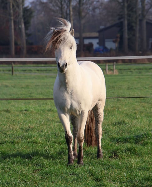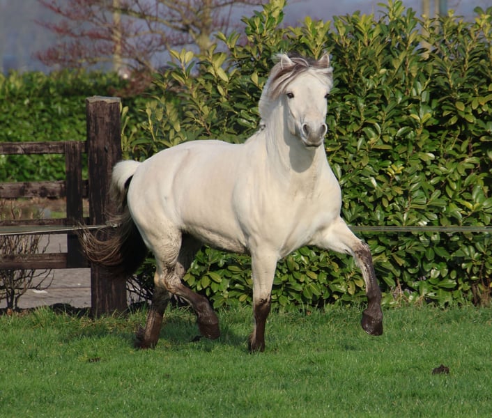 Utis is a beautiful, well-built 3-year-old white Fjord stallion. He moves very well! He is approved for breeding in Wickrath at the end of 2025. Utis is an easy stallion to handle and is an intelligent horse that enjoys working. He is broke to drive in a pairs. He is currently approximately 1.43 meters tall. He can be castrated if wanted.