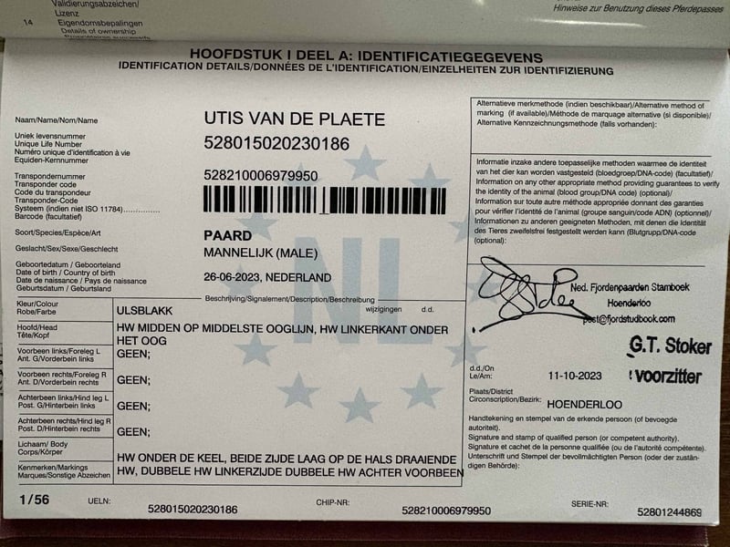 Utis est un beau étalon Fjord de 3 ans, bien construit et doté d’une belle stature. Il possède un excellent mouvement ! À la fin de l’année 2025, il sera approuvé pour la reproduction à Wickrath. Utis est un étalon agréable à manipuler, intelligent et qui aime travailler. Il est léger en harnais en paire. Il mesure actuellement environ 1,43 m. Pour la saison à venir, nous avons six étalons de reproduction, ce qui est en réalité trop. Nous pensons que les six sont de très bons étalons, mais malheureusement, nous n’avons pas assez de juments pour tous. C’est pourquoi nous sommes disposés à vendre Utis – ou éventuellement un de nos autres étalons – de préférence comme étalon de reproduction, car nous trouvons dommage qu’ils ne servent pas à produire des descendants...