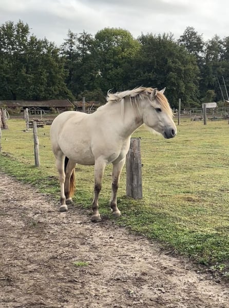 We are selling our self-bred white Fjord mare. Inskar was born and raised on our farm in April 2022, growing up among children, tractors, dogs, and the daily hustle of farm life. She is well accustomed to walks, riding out as a lead horse, ground work, saddling, and harnessing, remaining very calm in all situations. She is extremely affectionate, cuddly, and has a very open, curious, and fearless personality. She won first place at the foal show and comes with full papers; her dam is on-site. Her current height is approximately 143 cm (14.3 hh). We are selling her as a broodmare, as she sustained a leg injury in 2024, which caused an inflammation of her tendon, making her unsuitable for riding. Her teeth, hooves, and deworming are regularly maintained, and a dental passport is available. Please feel free to contact us with any questions or if you're interested.