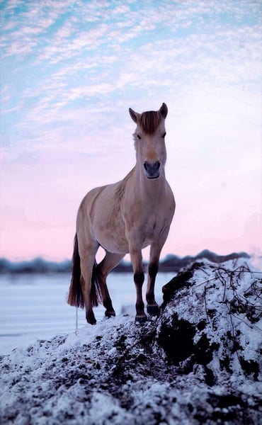 Hermosa y elegante yegua Fjord de color blanco-amarillo