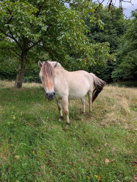 Due to a reduction in stock, we are selling our beautiful, large-framed Fjord mare Lavinia. She was born in 2019 and has a height of approximately 147 cm. She is well-behaved, easy to handle, and knows how to be shod and loaded, as well as lunged. Currently, she has a foal named Beifuß, which can also be purchased. She is in foal to Killimanjaro for 2026. For more information and pictures, please feel free to inquire.
