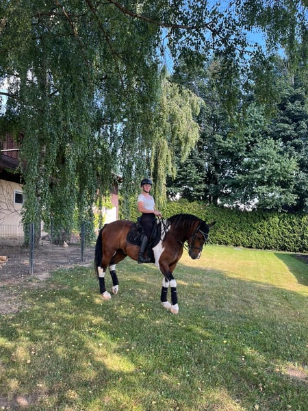 For sale is an impressive Polish Warmblood - gelding. This charming pinto not only impresses with his elegant appearance but also with his pleasant size, standing at 160 cm. Kilf is familiar with both open stabling and box stalls. He goes out in the field both in groups and alone. He is excellently suited for leisure riding and is familiar with trail rides and the arena. Klif requires an experienced rider who can ride independently of the reins. He is ambitious and needs to be worked with. If you are looking for a loyal leisure partner who will stand by you through thick and thin, then Klif could be the right one for you. If you are interested, we look forward to your contact.