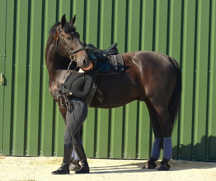 1st breed: Polish warmblood 2. age: currently 10 (will be 11 this year) 3. color: black 4. level of training: E/A dressage 5. easy to load and forge 6. shod in the front 7. no mental/physical illnesses 8. currently stands in the paddock with other horses during the day and in the box at night -> Compatible with all horses 9. does not show any bad habits when riding or handling, e.g. mounting, bucking, biting, etc. 10. knows the riding arena, arena and cross-country (goes well alone or in a group) 11. he has a relaxed and good-natured manner, can always be controlled, does not get his his "own head 12. also suitable for beginners