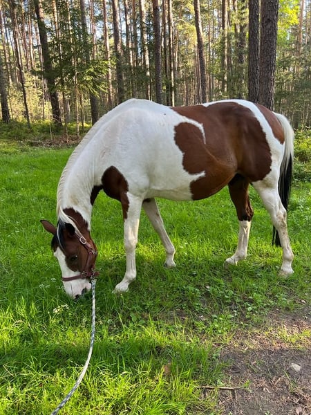 16-jähriger Wallach (2010), polnisches Warmblut (Schecke), mit guter Abstammung (Vollblut x Trakehner). Im ersten Moment ähnelt er einem Quarter Horse was sicherlich auch an seiner Färbung liegt und dem kurzen Körperbau. Er ist Ausdrucksstark, solide gebaut und feinfühlig im Umgang. Brav, menschenbezogen. Unter dem Reiter aufmerksam, lernwillig und fein an den Hilfen. Nervenstark und trittsicher im Gelände, läuft gerne und kann auch Gas geben. Herdenverträglich, kein Beißen oder Schlagen, artig beim Hufschmied. Ideal als Freizeitpferd für feinfühlige Reiter. Benötigt Herdenhaltung mit Auslauf. Sucht aufgrund geänderter Lebensumstände einen neuen, passenden Menschen.