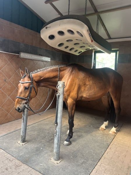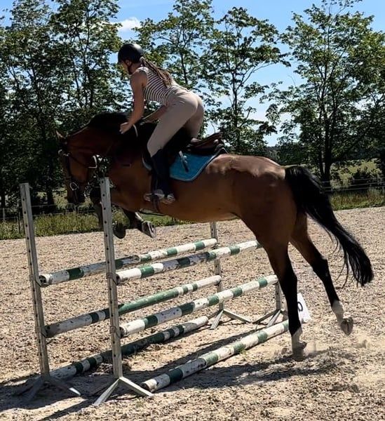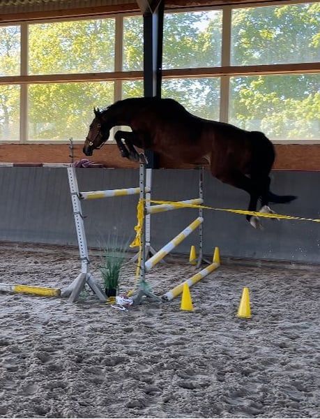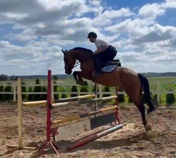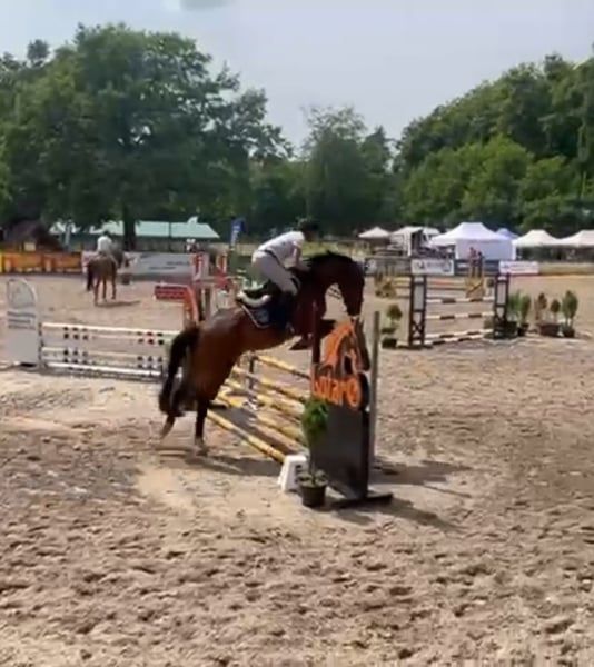1m won - 1 year in training. Now he is with a 15-year-old girl for riding participation. Unfortunately, we have no time. Free jumping 150cm is no problem for him. Below, the rider jumped single jumps of 120/130cm. Healthy and trouble-free horse. He runs in the lungeing machine every day. Sweet in the pasture. I can send several videos/information via WhatsApp.