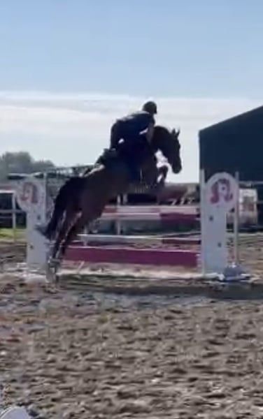 Gewonnen 1 Meter – 6 maanden training. Hij is 8 maanden in bezit van een 15-jarig meisje dat rijdt. Helaas hebben wij geen tijd meer. Vrij springen tot 150 cm is geen probleem voor hem. Hieronder een rijder die los springt, met individuele sprongen van 120/130/140 cm. Gezond en probleemloos paard. Elke dag loopt hij in de longeerbak en op de wei samen met andere paarden. Meer video's en informatie stuur ik graag via WhatsApp.