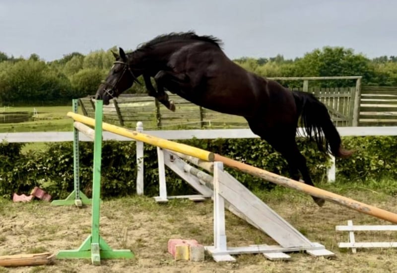 Prend 4 ans en 2026, elle mesure 1m68 actuellement Plein papier, le père (cheval allemand) a sauté 1m35 Elle est débourrée, elle a de la force et du sang Elle a passé une visite véto avec 20 clichés radios qui est ok