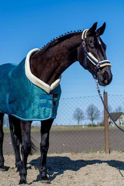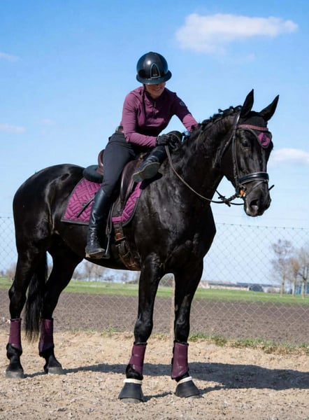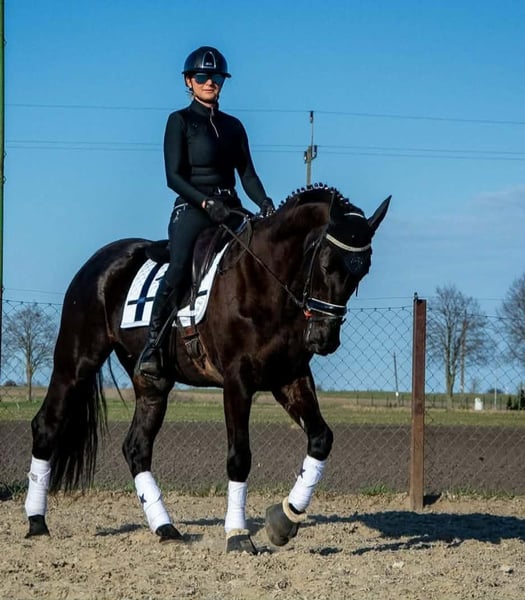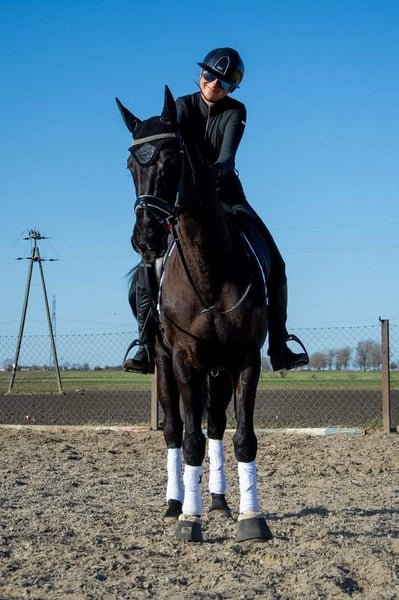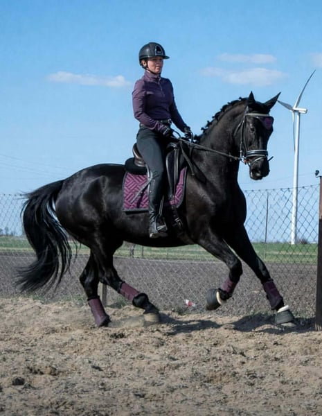 6Y black mare, 168 cm tall. This mare has experience in carriage driving, has participated in competitions, and has been seen at city festivals. She is very pleasant to ride, cooperative, and willing to work. She is safe and well-behaved in the saddle, even for small children, and is therefore suitable for an amateur rider. She is easy to handle, does not kick or bite, and is good with children. She is gentle with people and other animals and behaves very well in a herd. She can be easily transported in a trailer. She gave birth to a black foal with four white socks The mare has a valid veterinary inspection (TÜV) from February 2026.