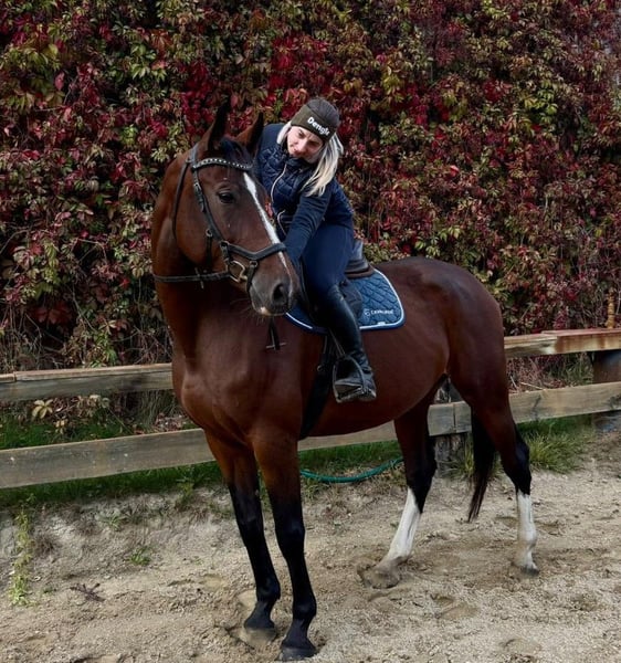 For sale: a 6-year-old mare from my own breeding. She is a well-balanced horse, eager to work, focused on the task at hand. Respectful of humans and extensively ground-trained. She has a very good canter and jumping technique. She was started late in her training, in the autumn of last year (I wasn’t in a rush, as she was meant to be a horse for me). She progresses quickly. She also rides in the field, both alone and with other horses. New environments do not faze her. She travels without issues, both alone and with other horses. Due to her temperament, she is suitable for an amateur rider. I am looking for a loving, responsible home. More information available by phone.