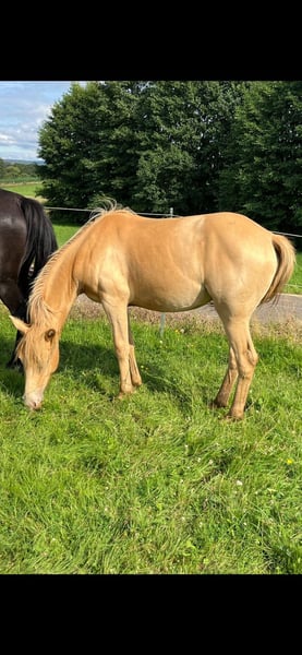 Magnifique jument dorée du 04.06.2023. Elle grandit de manière robuste dans le troupeau de juments. Au quotidien, elle est proche des gens et respectueuse. Ses mouvements rapides et bien équilibrés font d'elle une parfaite jument polyvalente. Elle connaît les voitures, les tracteurs, les enfants, les cyclistes, les vaches et bien d'autres choses encore. Elle se tient également dans le ruisseau pour manger la verdure fraîche sur la pente. Si vous cherchez un cheval robuste et compact, c'est elle qu'il vous faut. Cela vaut la peine de l'examiner. Pour plus d'informations, contactez-nous par téléphone. Vous cherchez quelque chose de spécial, alors c'est la bonne.