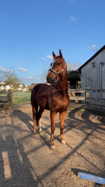 Dioniss ist ein bildhübscher Wallach, der mit seinen drei wunderbaren Grundgangarten und seiner tollen Rittigkeit überzeigt. Vor gut einem Jahr habe ich ihn gekauft, selbst angeritten und mit viel Freude Schritt für Schritt trainiert und gefördert. Dabei war er stets neugierig, motiviert und voller Spaß bei der Arbeit. Im Springen wie auch der Dressur beherrscht er die Grundaufgaben und zeigt sich stets lernwillig. Auch in der Bodenarbeit, beispielsweise der Stangenarbeit, ist er mit Begeisterung dabei. Das Gelände kennt er ebenfalls - dort zeigt er sich interessiert, mutig und immer positiv eingestellt. Bei uns steht Dioniss in einer kleinen Wallach Herde im Offenstall, er kennt allerdings auch eine Box. Dioniss ist sehr menschenbezogen, freundlich und ein treuer Partner, der stets das Beste geben möchte. Er ist offen für neue Aufgaben und möchte weiter gefördert werden. Den Hufschmied kennt er und verhält sich dabei brav und gelassen - er läuft Barhuf. Mit seiner hervorragenden Abstammung bringt er viel Potential mit, das entdeckt und gefördert werden möchte. Leider muss ich ihn aus zeitlichen Gründen abgeben und wünsche mir daher für ihn einen Partner an seiner Seite, der sein Talent erkennt und ihn liebevoll weiter auf seinem Weg begleitet. Da er selbst noch am Anfang seiner Ausbildung steht, ist er jedoch kein Anfängerpferd. Bei wirklichem Interesse, gerne eine WhatsApp schreiben, oder gleich anrufen unter der Nummer: 015155564960.